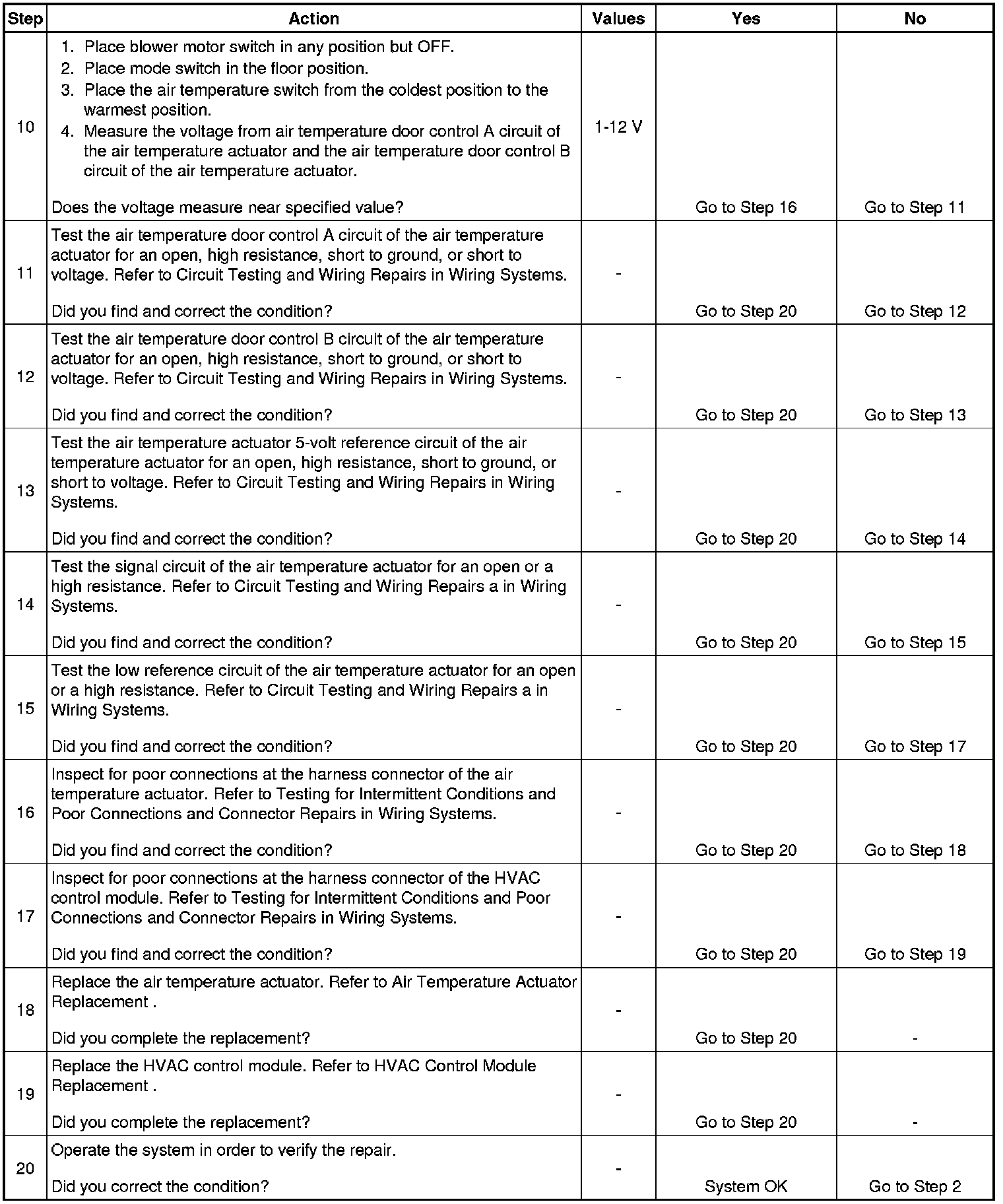10. The voltage will vary between 0-12 volts during normal operation. The HVAC control module connector must be connected during this step. The voltage should be monitored while air temperature actuator is commanded to move.