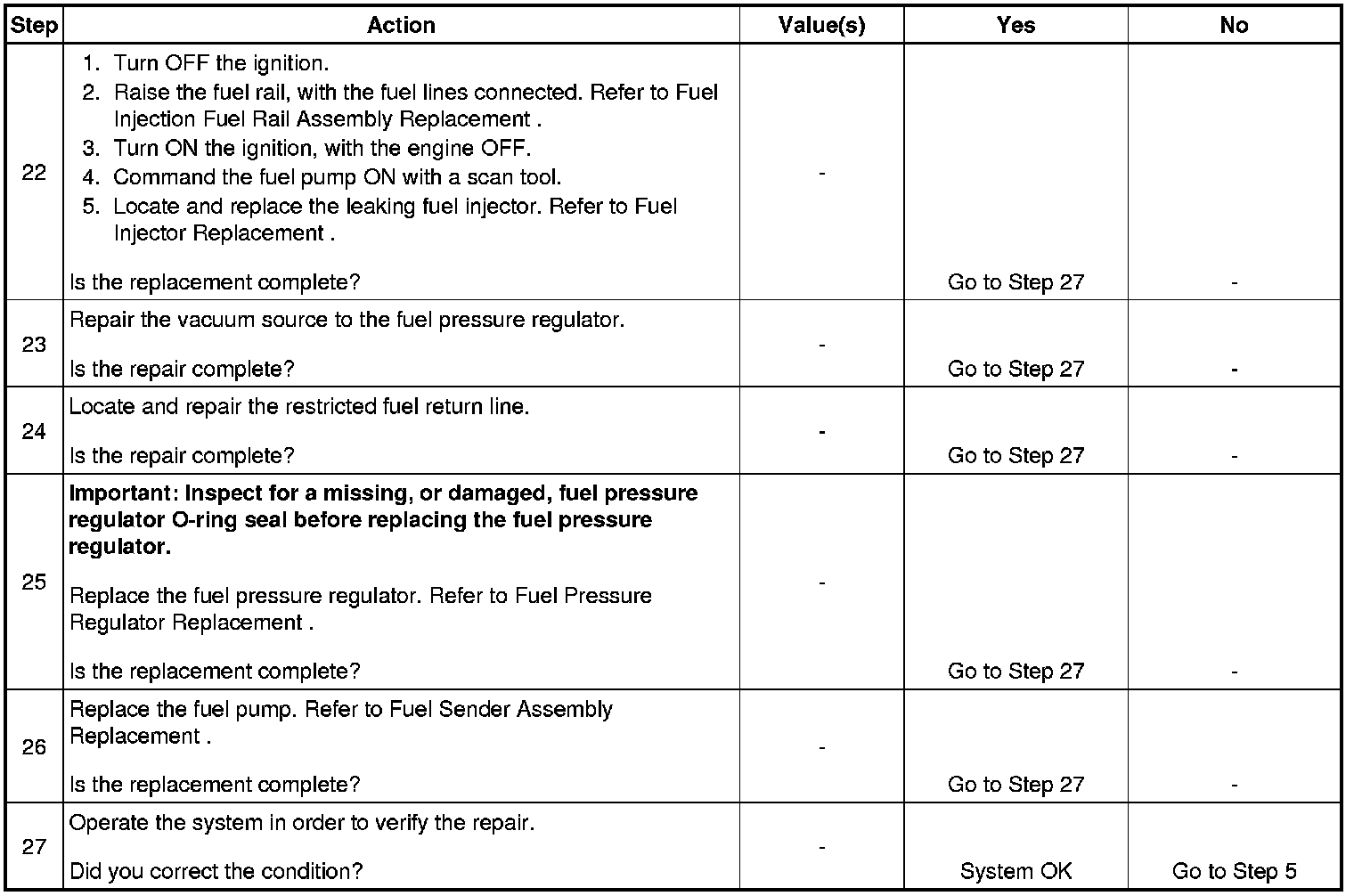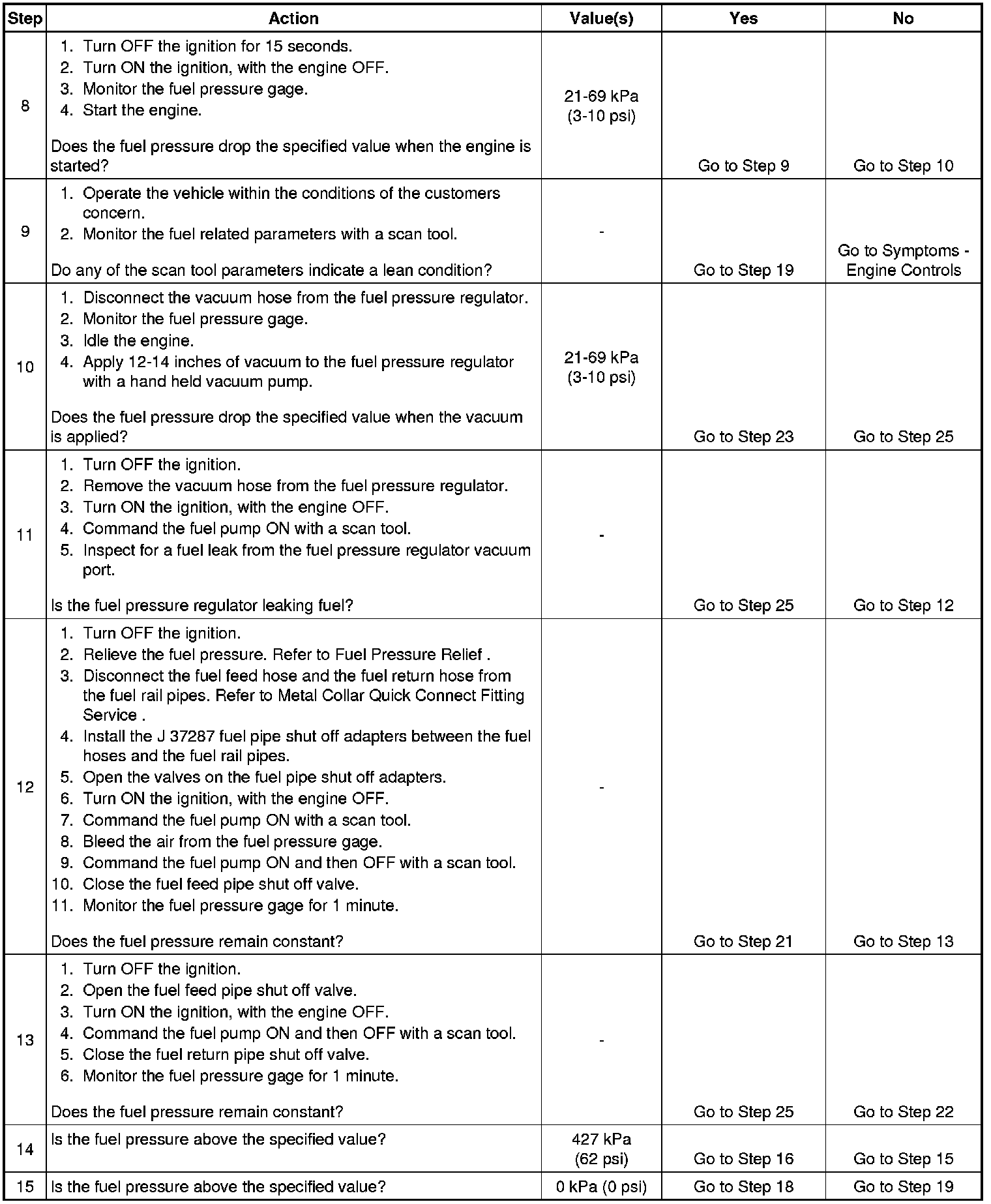 13. This step tests for a leaking fuel injector, or fuel pressure regulator. If the fuel pressure remains constant during this test, the fuel injectors are not leaking fuel.