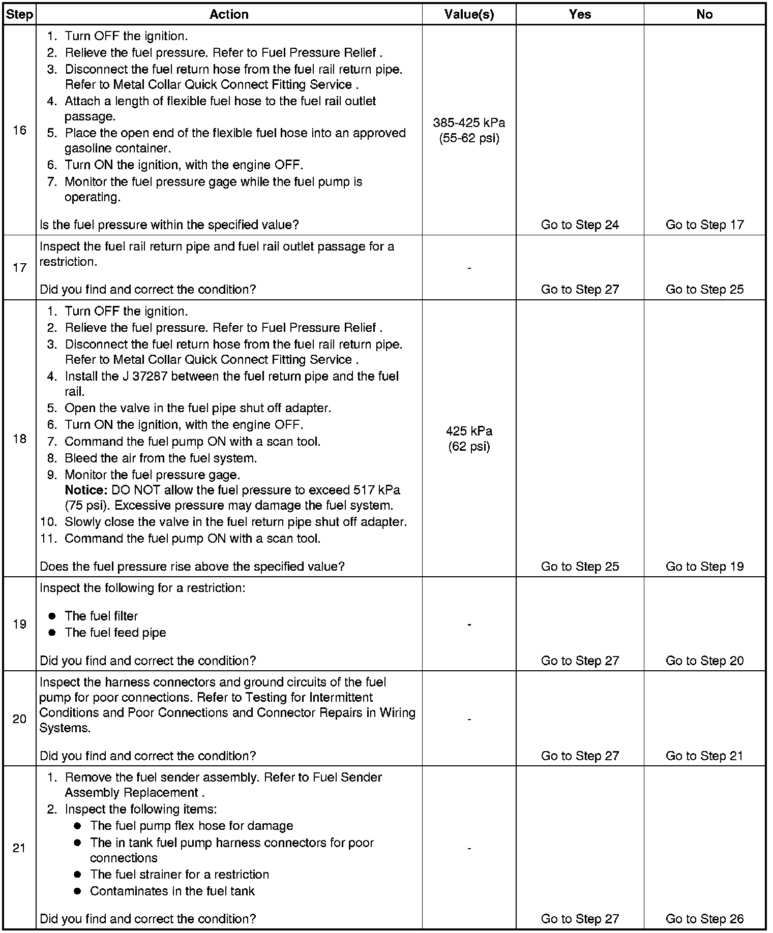 16. This step tests for a restricted fuel return pipe. If the fuel pressure is within the specified values, a restriction in the fuel return pipe is indicated.