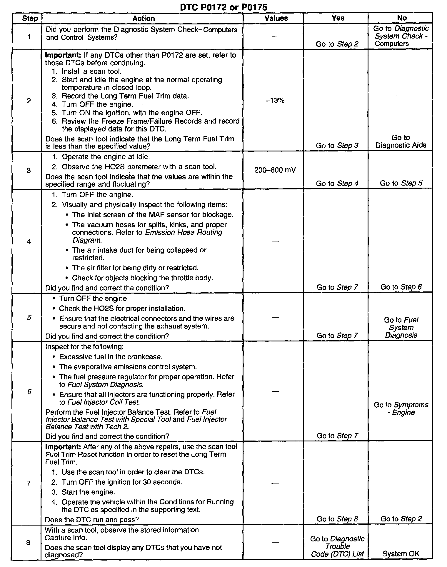 CIRCUIT DESCRIPTIONThe Powertrain Control Module (PCM) controls the air/fuel metering system in order to provide the best possible combination of driveability, fuel economy, and emission control. Fuel delivery is controlled differently during open and closed loop. During open loop the PCM determines fuel delivery based on sensor signals without oxygen sensor input. During closed loop, the oxygen sensor inputs are added and used by the PCM to calculate short and long term fuel trim fuel delivery adjustments. If the oxygen sensors indicate a lean condition, the fuel trim values will be above 0 percent. If the oxygen sensors indicate a rich condition, the fuel trim values will be below 0 percent. Short term fuel trim values change rapidly in response to the Heated Oxygen Sensor (HO2S) voltage signals. Long term fuel trim makes coarse adjustments in order to maintain an air/fuel ratio of 14.7:1. The fuel trim diagnostic will conduct a test to determine if a rich failure actually exists, or if excessive vapor from the Evaporative Emission (EVAP) canister is causing a rich condition. If the PCM detects an excessively rich condition, this Diagnostic Trouble Code (DTC) will set. If the PCM detects excessive vapor, then a pass is logged.