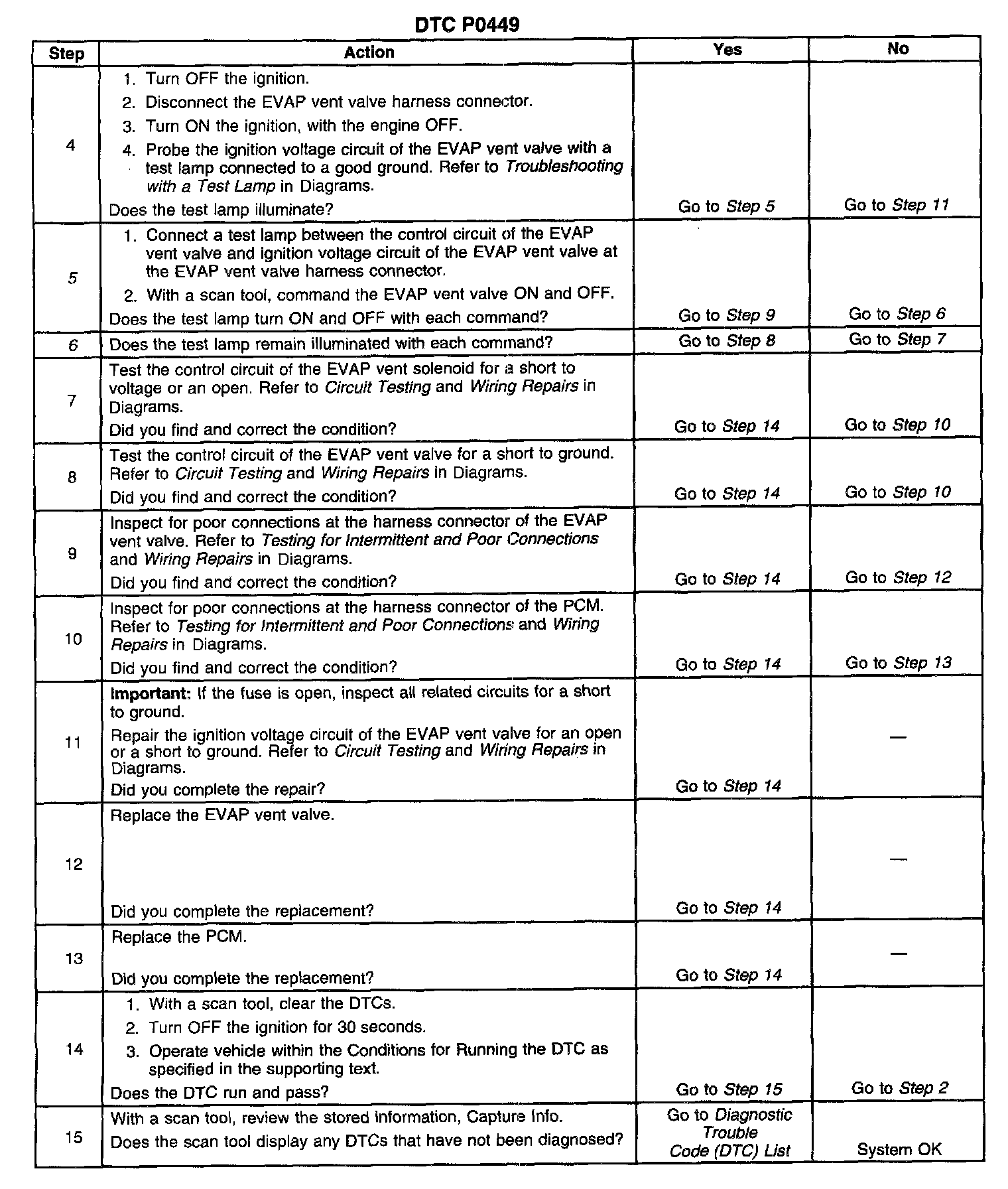 CIRCUIT DESCRIPTIONAn ignition voltage is supplied directly to the EVAP canister vent valve. The Powertrain Control Module (PCM) controls the EVAP vent valve by grounding the control circuit via an internal switch called a driver. The primary function of the driver is to supply the ground for the controlled component. The PCM monitors the status of the driver. If the PCM detects an incorrect voltage for the commanded state of the driver, DTC P0449 sets