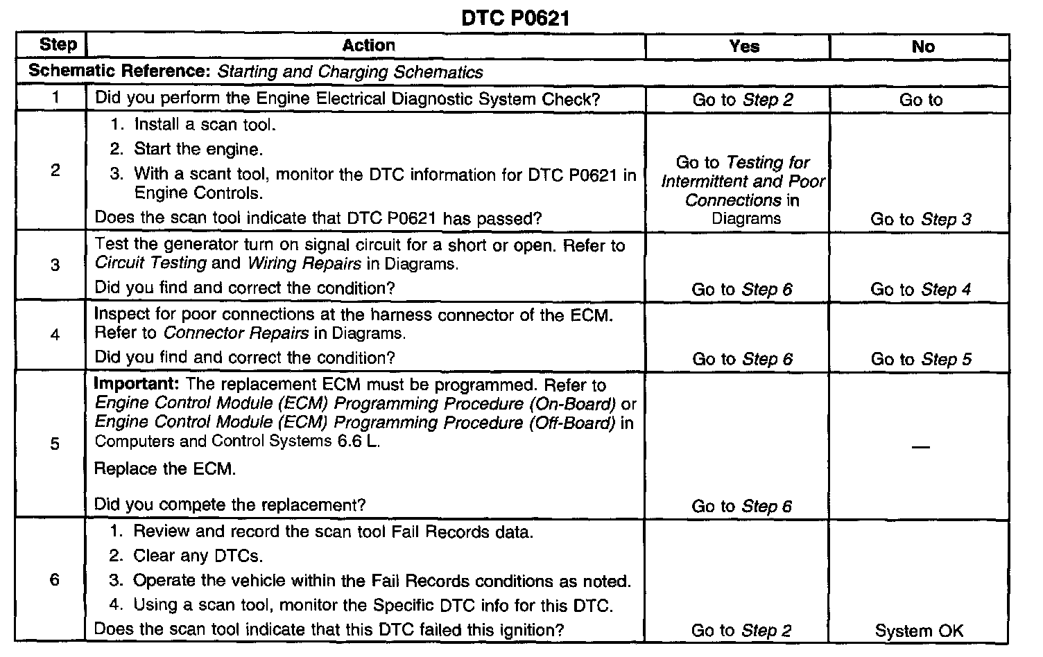 The ECM monitors the state of the generator turn on signal circuit. The ECM should detect a low generator turn on signal circuit voltage when the key is ON and the engine is OFF, or when the charging system malfunctions. With the engine running, the ECM should detect a high generator turn on signal circuit. The ECM performs key ON and RUN tests to determine the status of the generator turn on signal circuit. During the key ON test, if the ECM detects a high generator turn on signal circuit voltage, DTC P0621 will set. DTC P0621 will also set if, during the RUN test, the ECM detects a low generator turn on signal circuit. When the DTC sets, the ECM will turn on the charge indicator in the IPC.