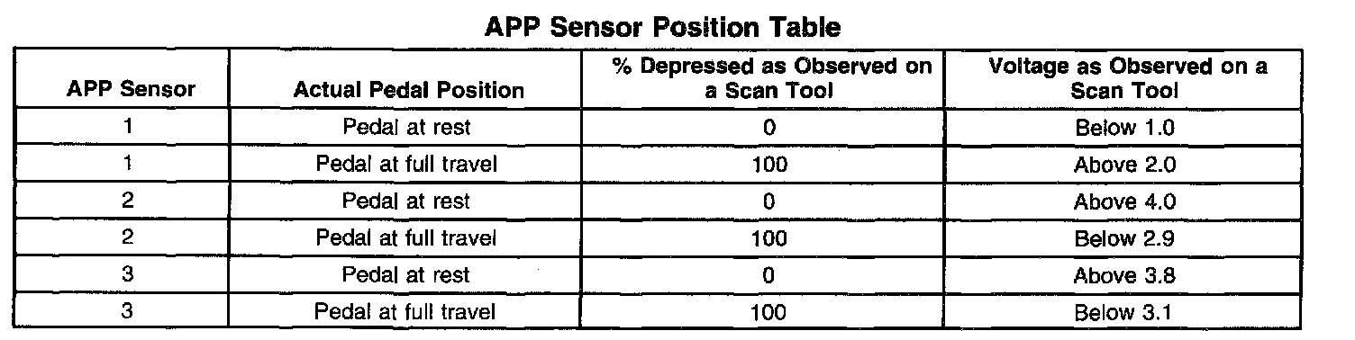 The table shows the percentage and voltage readings of the scan tool based on the position of the APP.