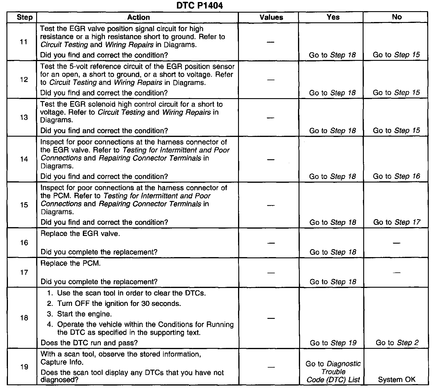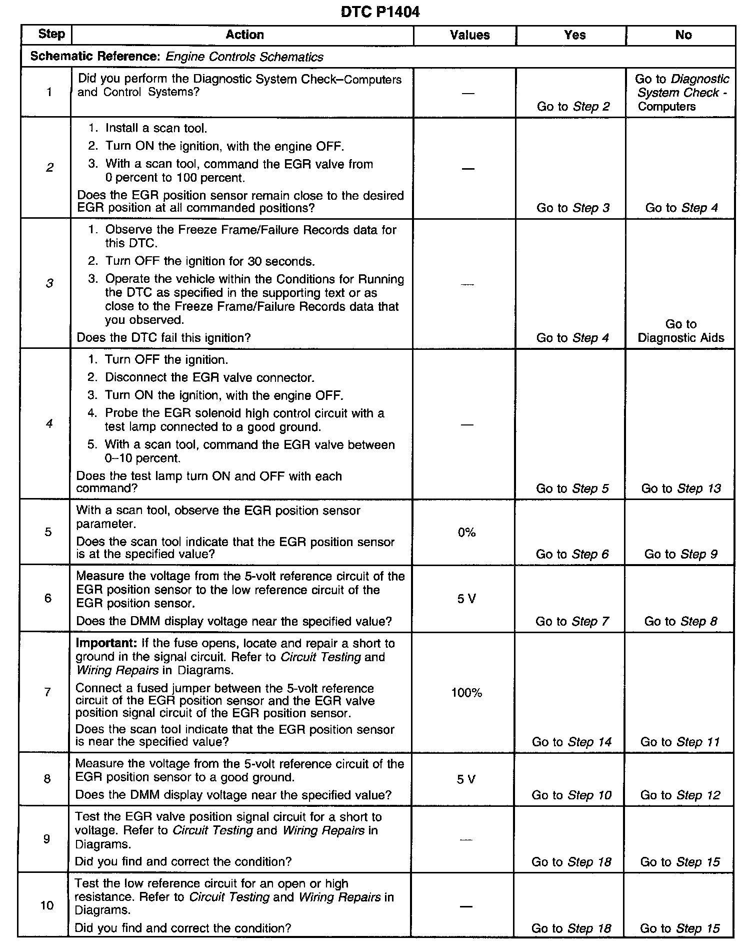 3. If DTC P1404 will only set under certain conditions, the malfunction may be intermittent. Refer to Diagnostic Aids. If an intermittent wiring problem is not present, test for a faulty connection at the PCM or the EGR valve. If the connections are OK and DTC P1404 continues to set, replace the EGR valve.