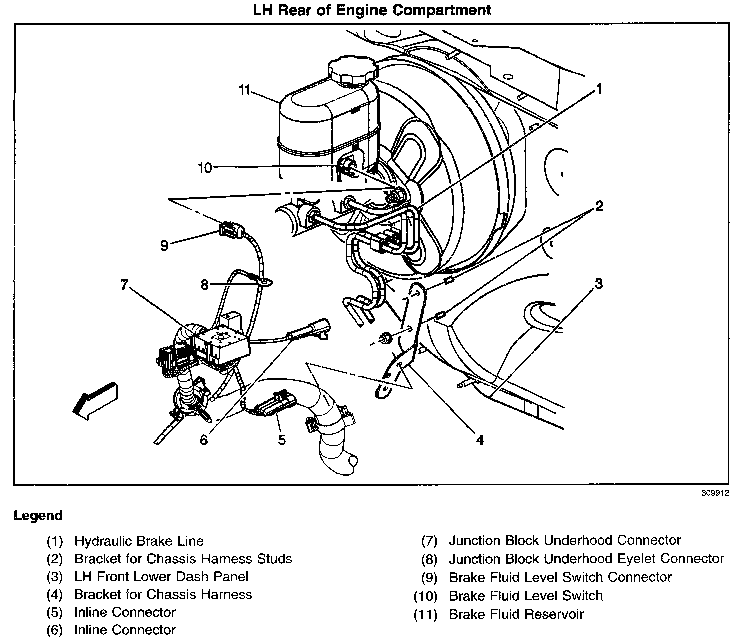 On the left side of the brake fluid reservoir