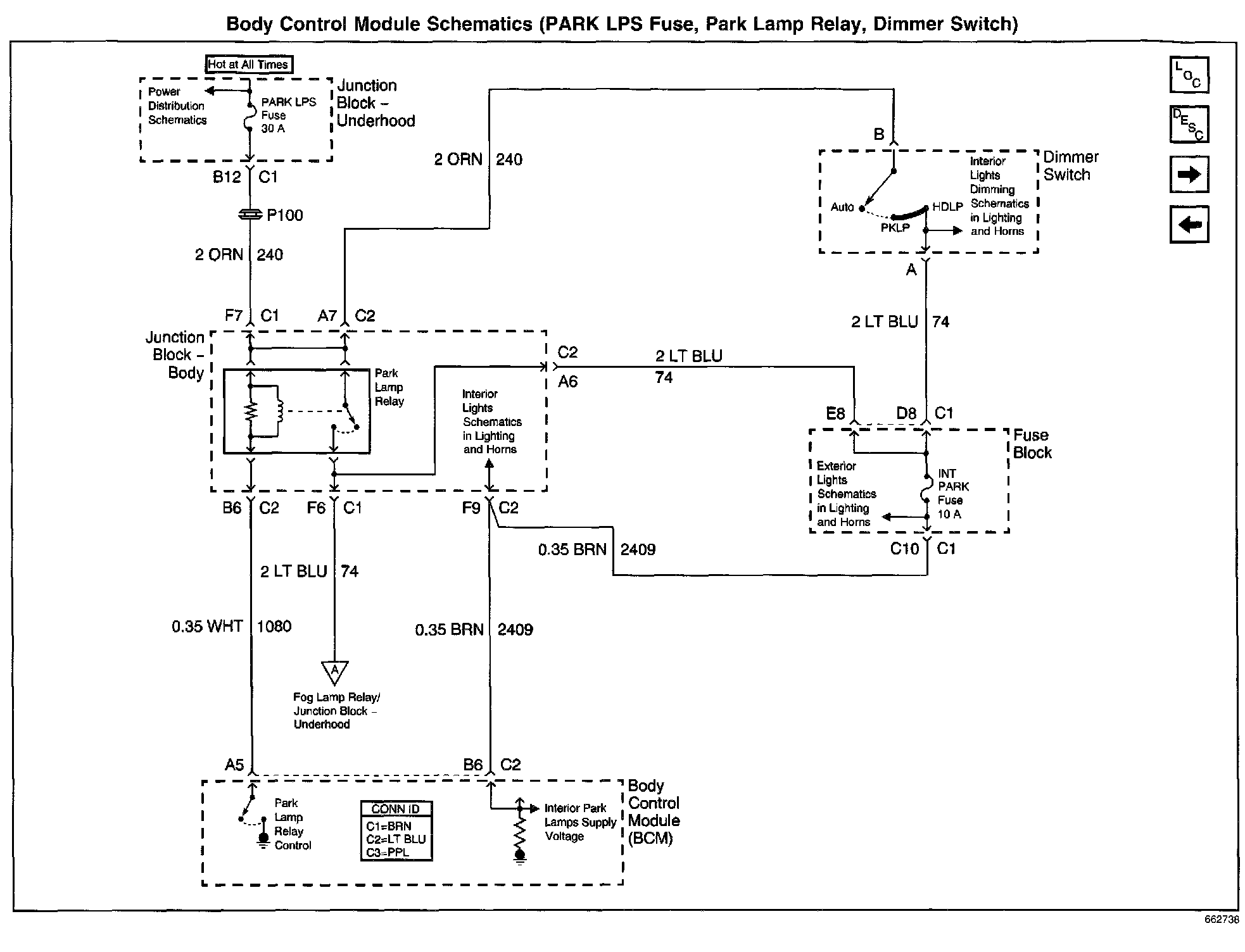 Body Control Module Schematics: PARK LPS Fuses, Park Lamp Relay, Dimmer Switch: