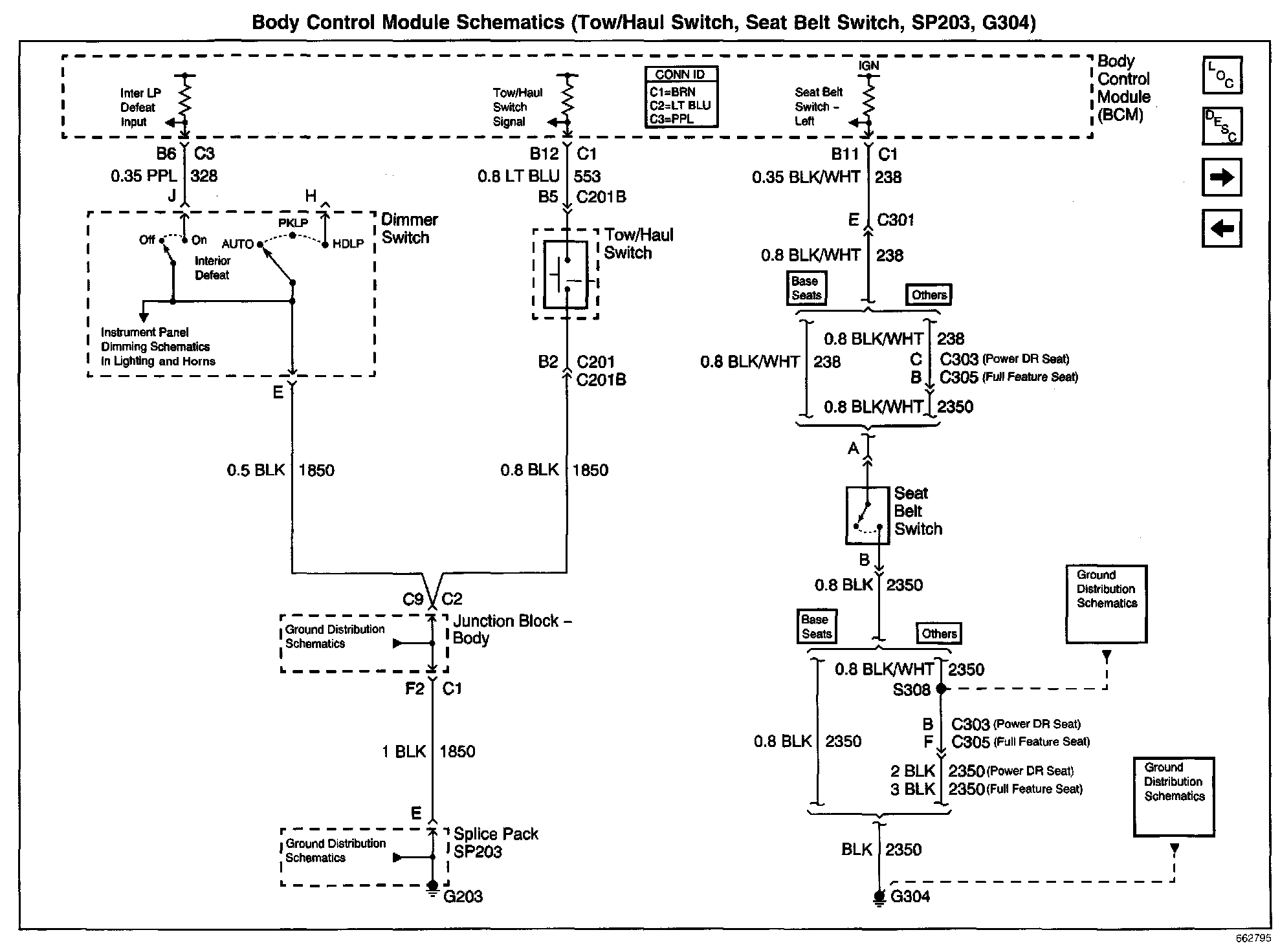 Body Control Module Schematics: Tow/Haul Switch, Seat Belt Switch, SP203, G304: