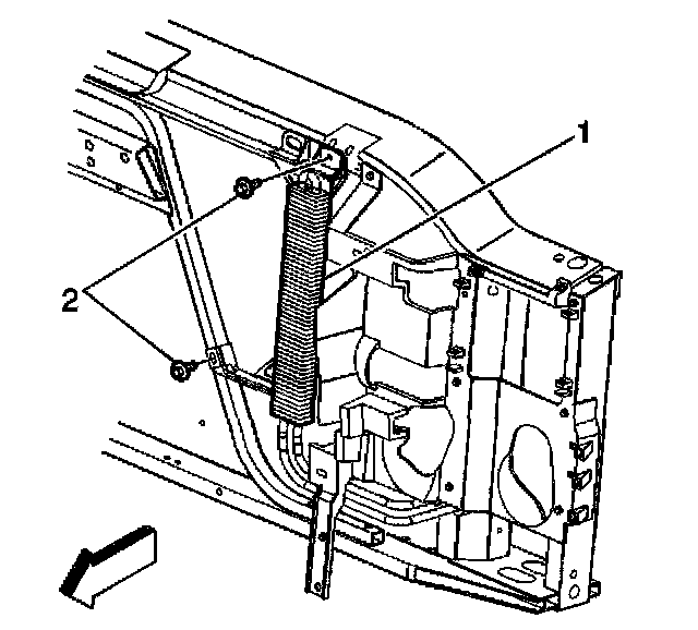 5. Remove the bolts (2) retaining the power steering cooler from the radiator support.