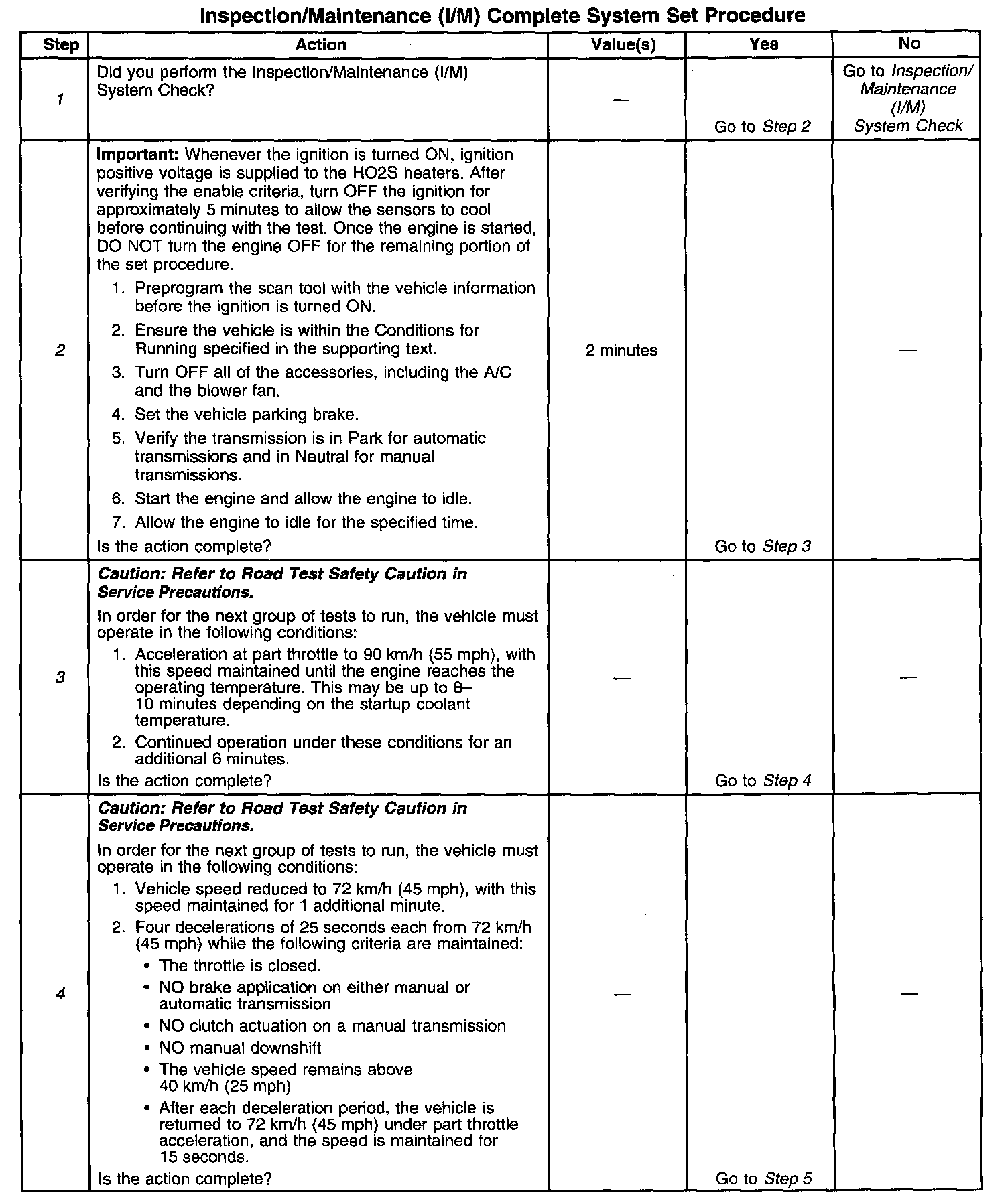 DESCRIPTIONThe purpose of the I/M Complete System Set Procedure is to satisfy the enable criteria necessary in order to execute all of the I/M readiness diagnostics, and to complete the trips for those particular diagnostics. When all diagnostic tests are completed, the I/M System Status indicators are set to YES. Perform this test when more than one or all of the I/M System Status indicators are set to NO.