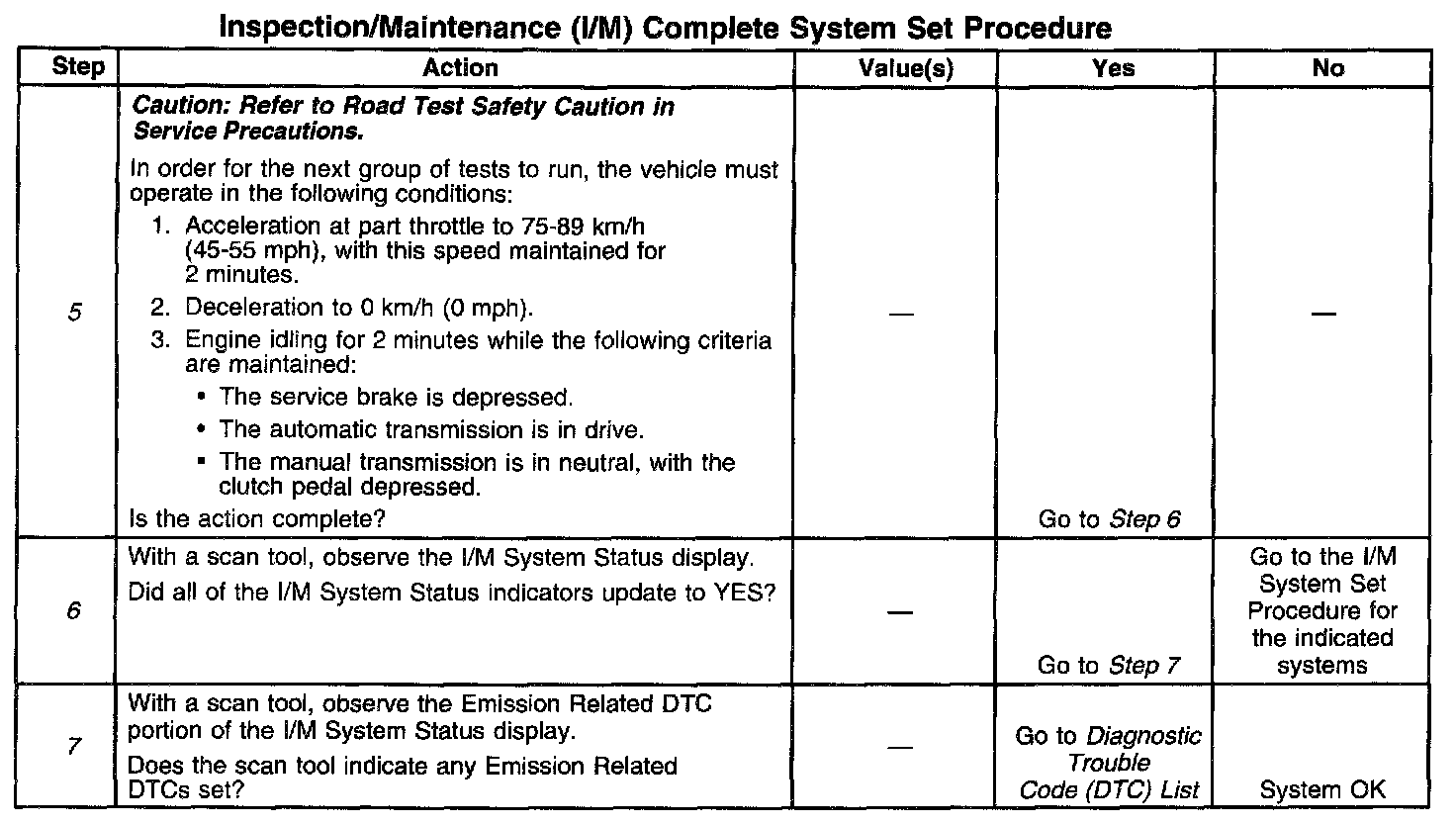 7. The I/M System Status only reports on whether a diagnostic has run, not the outcome of the test. If any emission-related DTC sets after the tests are complete, the DTC will require diagnosis.