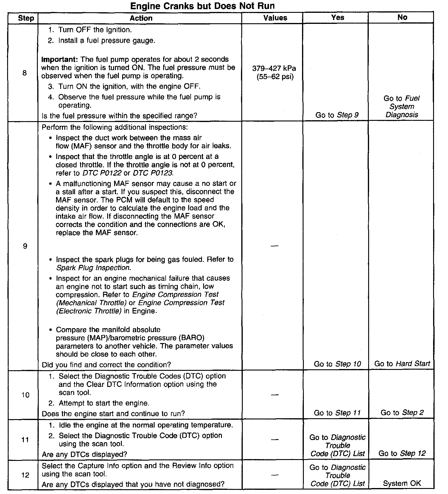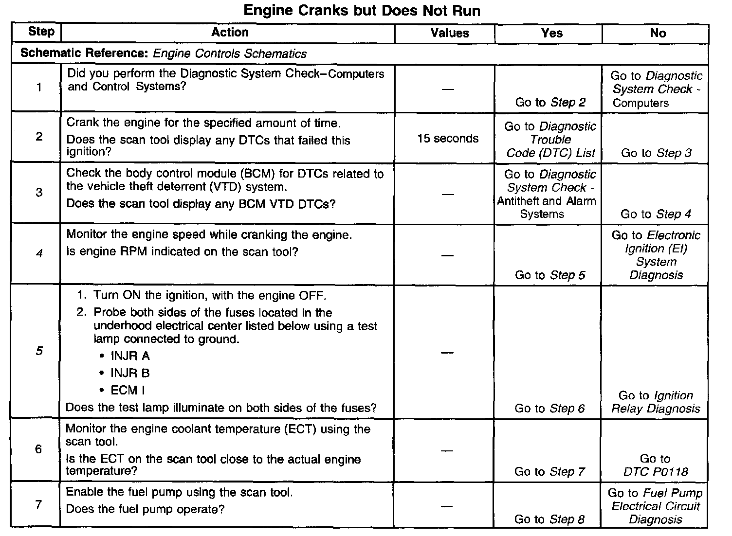 The Engine Cranks but Does Not Run diagnostic table is an organized approach to identifying a condition that causes an engine to not start. The diagnostic table directs the service technician to the appropriate system diagnosis. The diagnostic table assumes the following conditions are met: