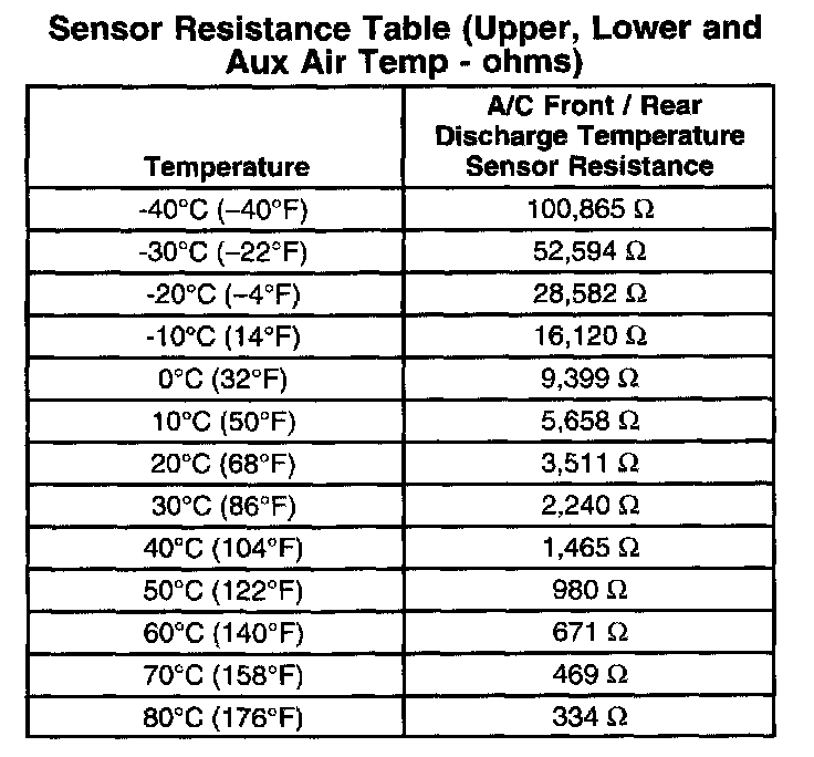 Sensor Resistance Table (Upper, Lower And Aux Air Temp - Ohms):