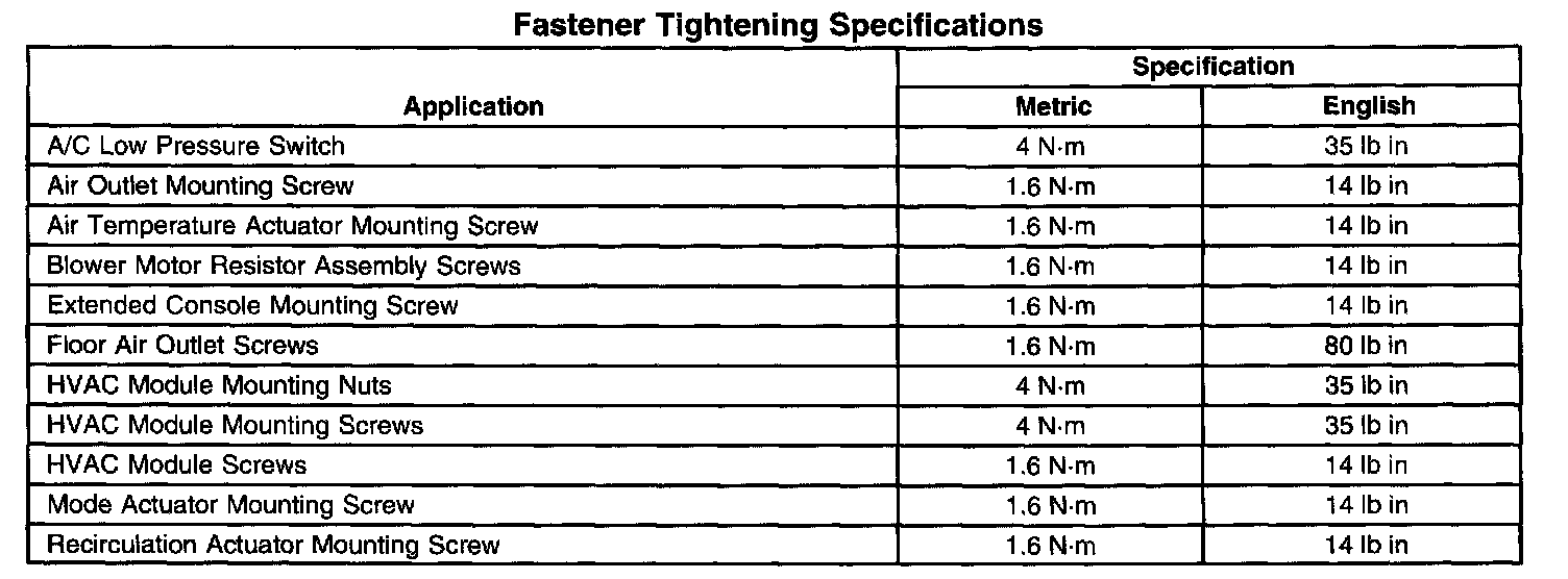 Fastener Tightening Specifications: