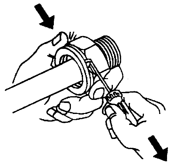 6. Pull on the open ends of the retaining ring in order to rotate the retaining ring around the quick connect fitting until the retaining ring is out of the fitting.
