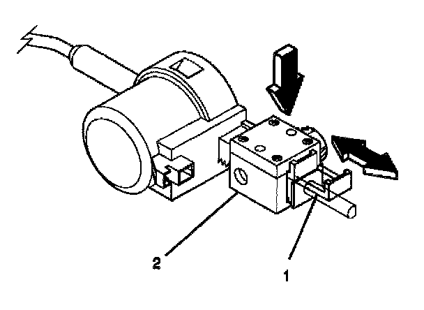 3.1. Pull out the tab (1) on the adjuster block side (2) of the automatic transmission shift lock control actuator.