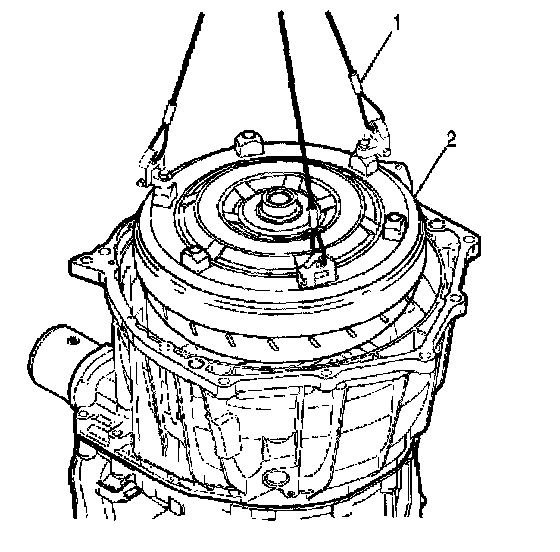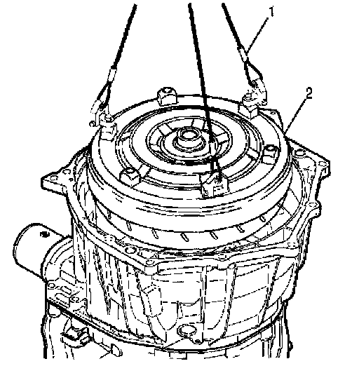 5. Attach a three-strand sling (1) to the torque converter (2). Lift the torque converter (2) from the transmission and set it safely aside.
