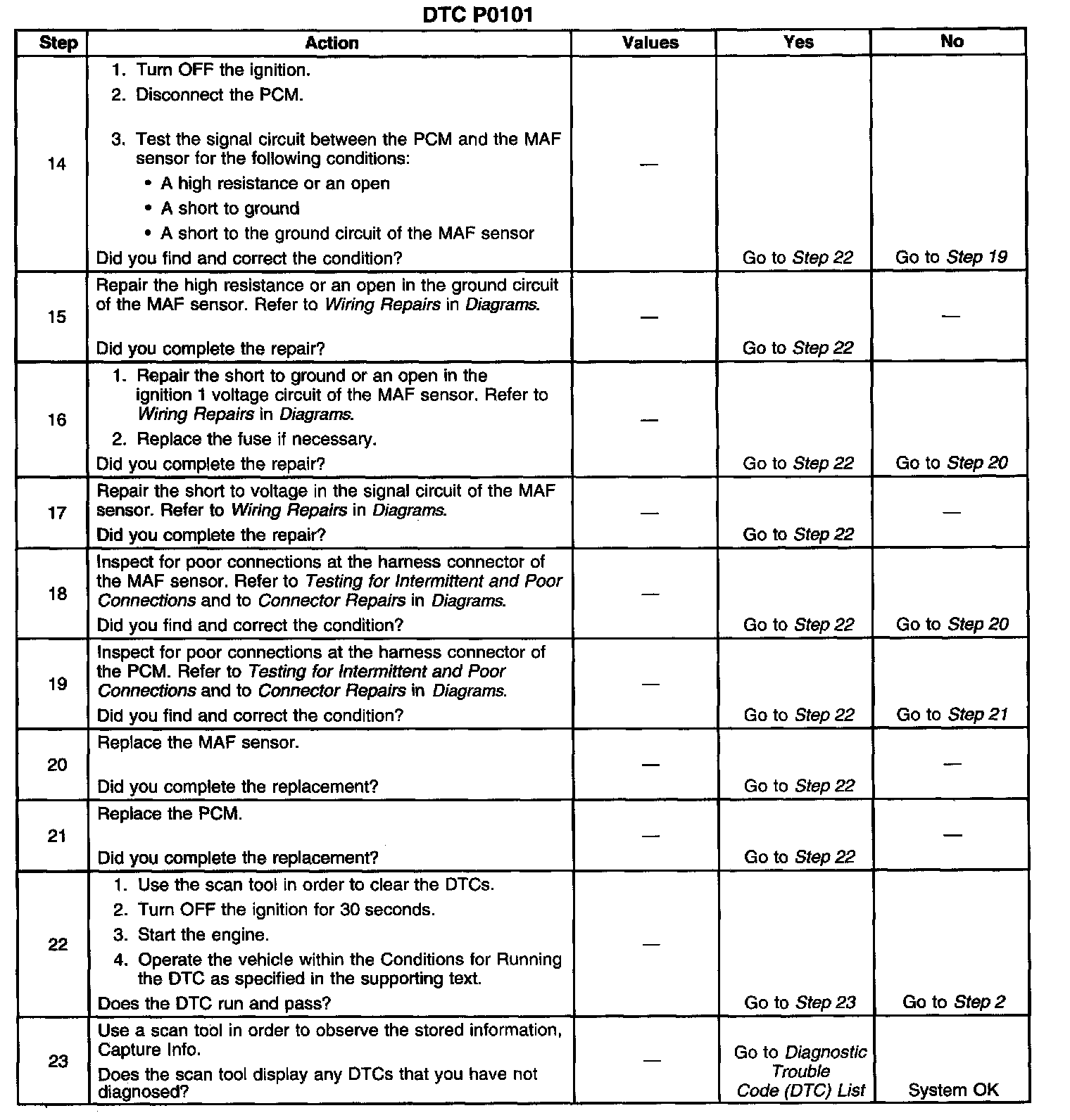 2. Diagnose any MAF, MAP, or system voltage DTCs before using this table. If a misfire condition exists or a rough running condition is observed with or without DTC P0300, proceed to DTC P0300 first.