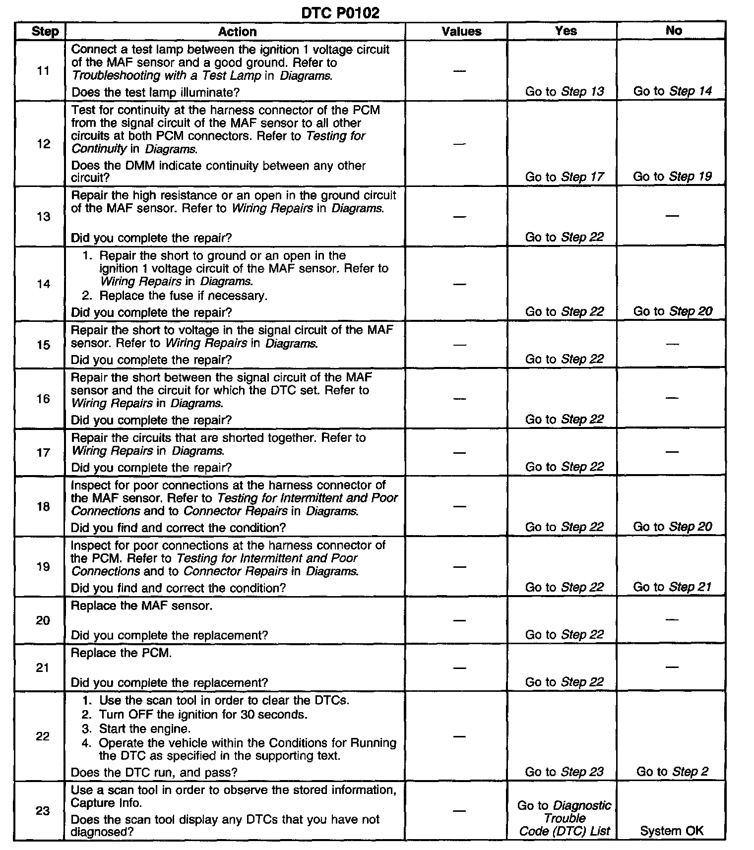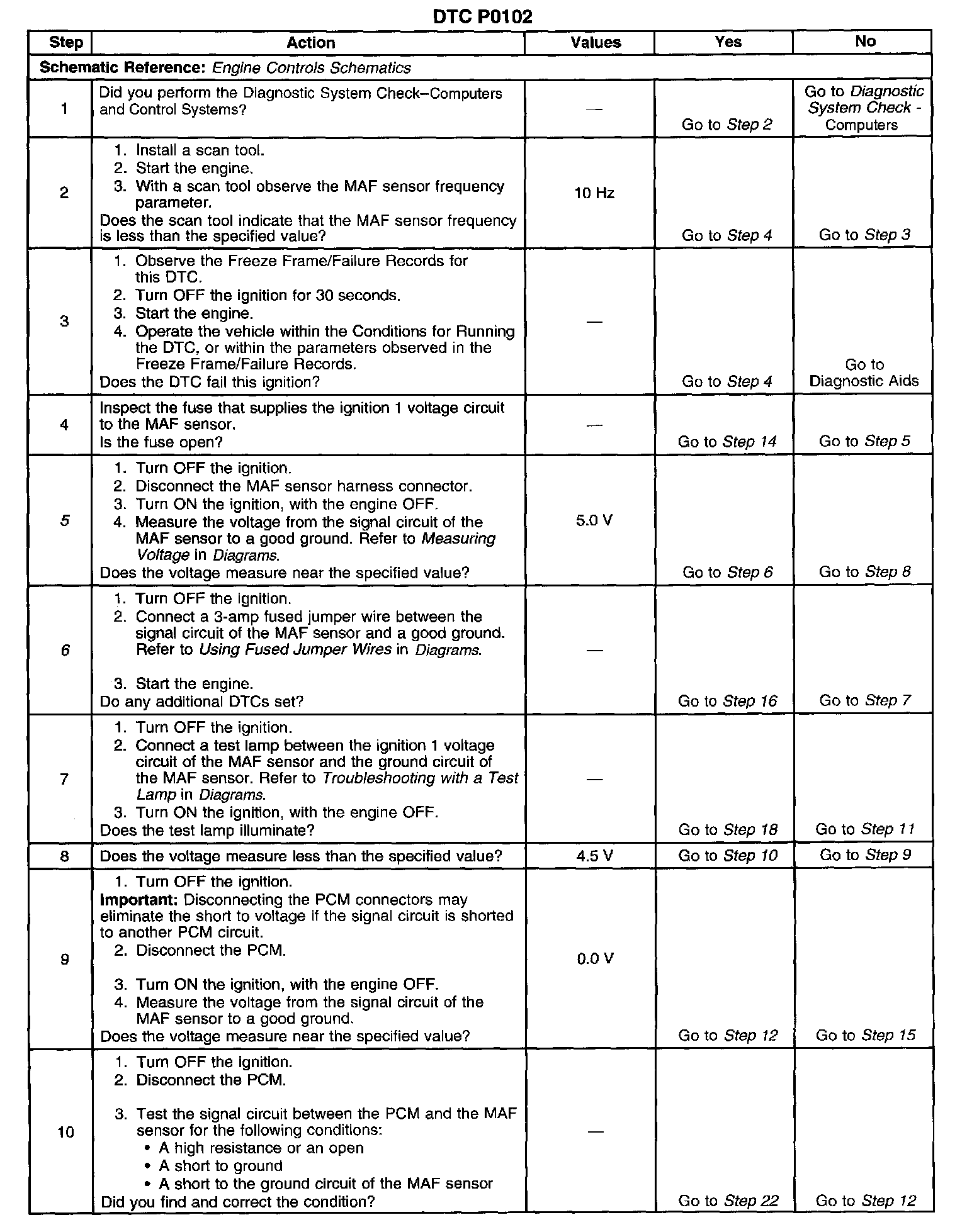 CIRCUIT DESCRIPTIONThe Mass Air Flow (MAF) sensor is an air flow meter that measures the amount of air entering the engine. The Powertrain Control Module (PCM) uses the MAF sensor frequency signal in order to provide the correct fuel delivery for a wide range of engine speeds and loads. A small quantity of air entering the engine indicates deceleration or idle. A large quantity of air entering the engine indicates an acceleration or high load situation. The MAF sensor has an ignition 1 voltage circuit, a ground circuit and a signal circuit. The PCM applies a voltage to the sensor on the signal circuit. The sensor uses the voltage in order to produce a frequency based on inlet air flow through the sensor bore. DTC P0102 will set If the PCM detects a frequency signal lower than the possible range of a normally operating MAF sensor.