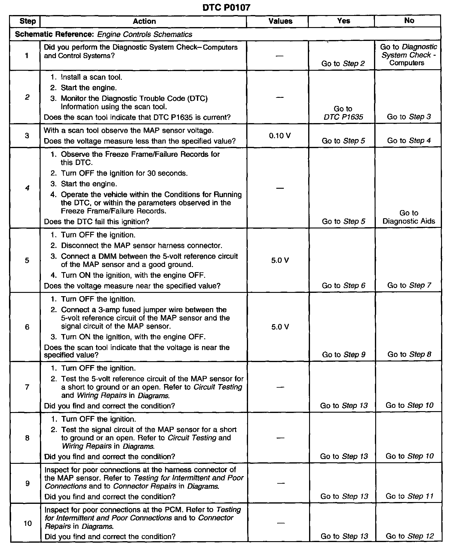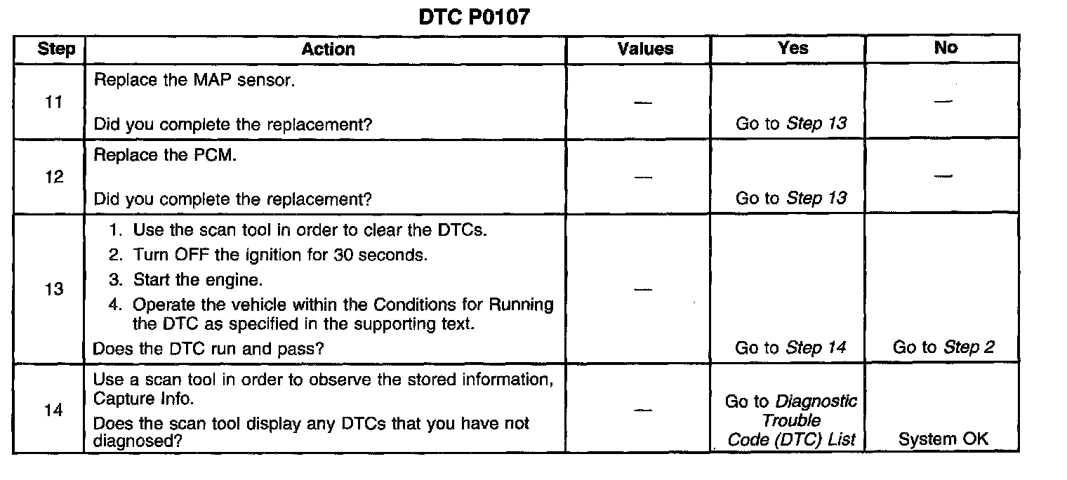 If the PCM detects a MAP sensor signal voltage that is excessively low, DTC P0107 will set.