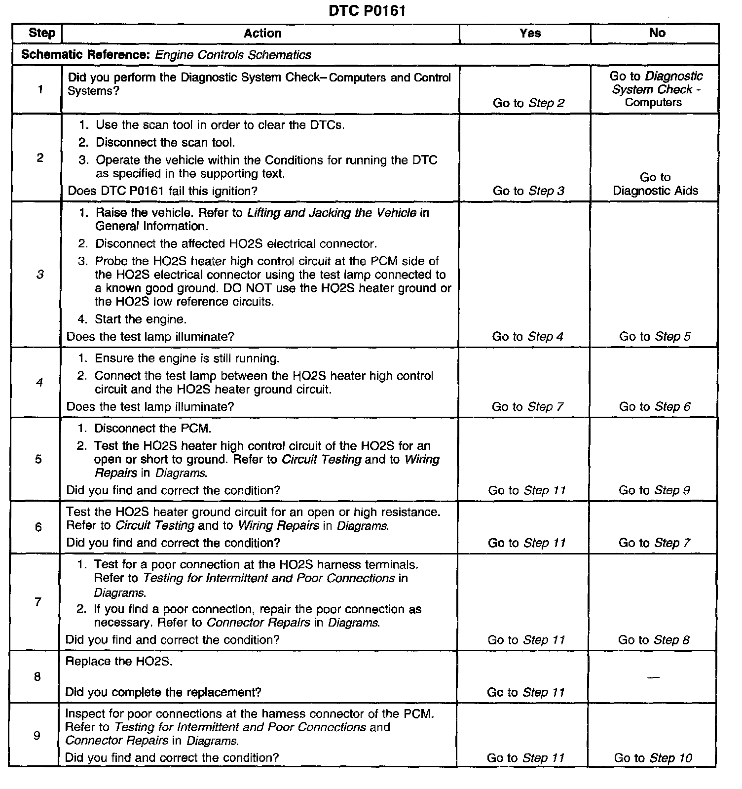 The numbers below refer to the step numbers on the diagnostic table.