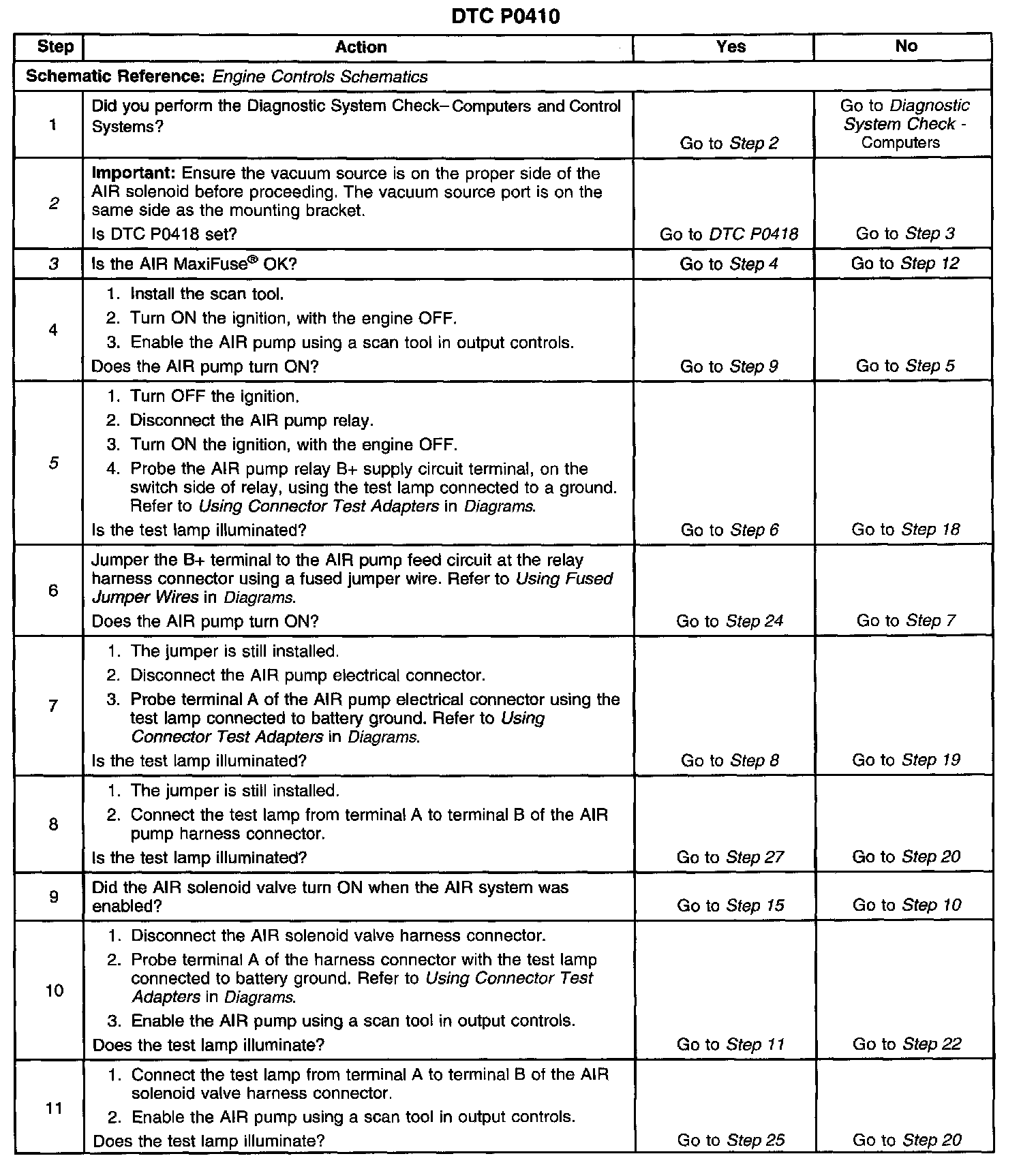 2. If DTC P0418 sets, this indicates the control side of the relay is not operating. Vacuum lines that are reversed on the AIR solenoid causes this DTC to set.