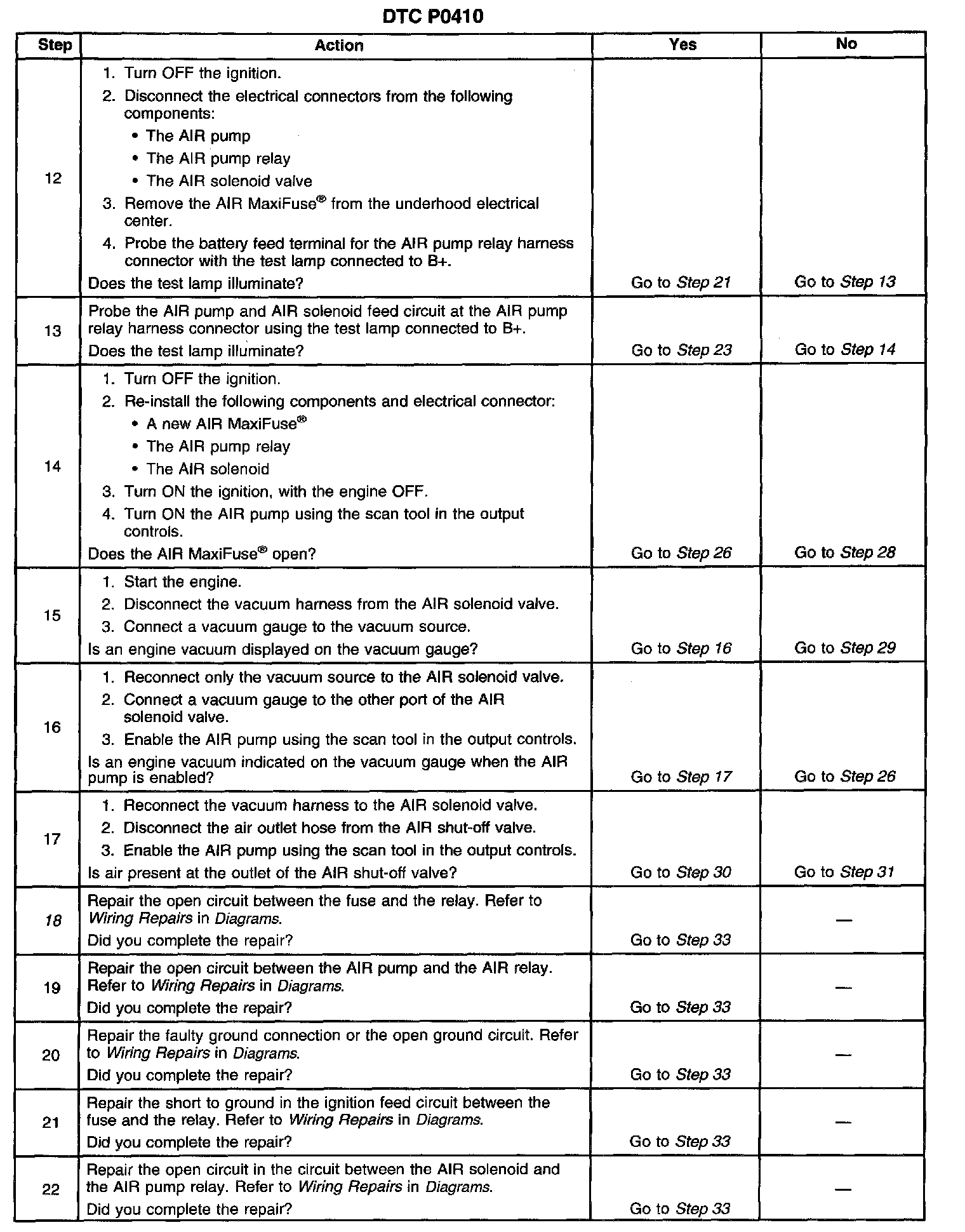 18. Inspect for intermittent shorts to ground if the AIR pump functions properly.