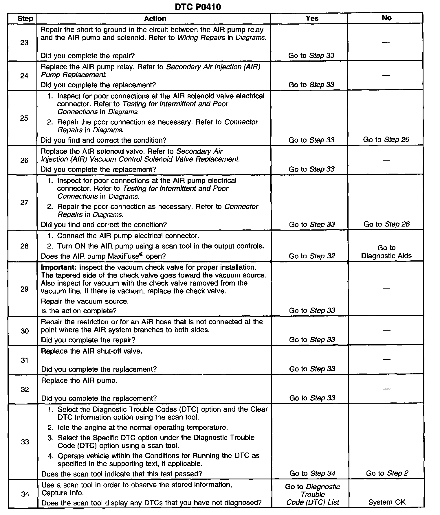 If the PCM determines that the HO2S voltages for both banks did not respond as expected during the tests, DTC P0410 sets. If only one sensor responded, the PCM sets either a DTC P1415 or P1416 in order to indicate on which bank the AIR system is inoperative.
