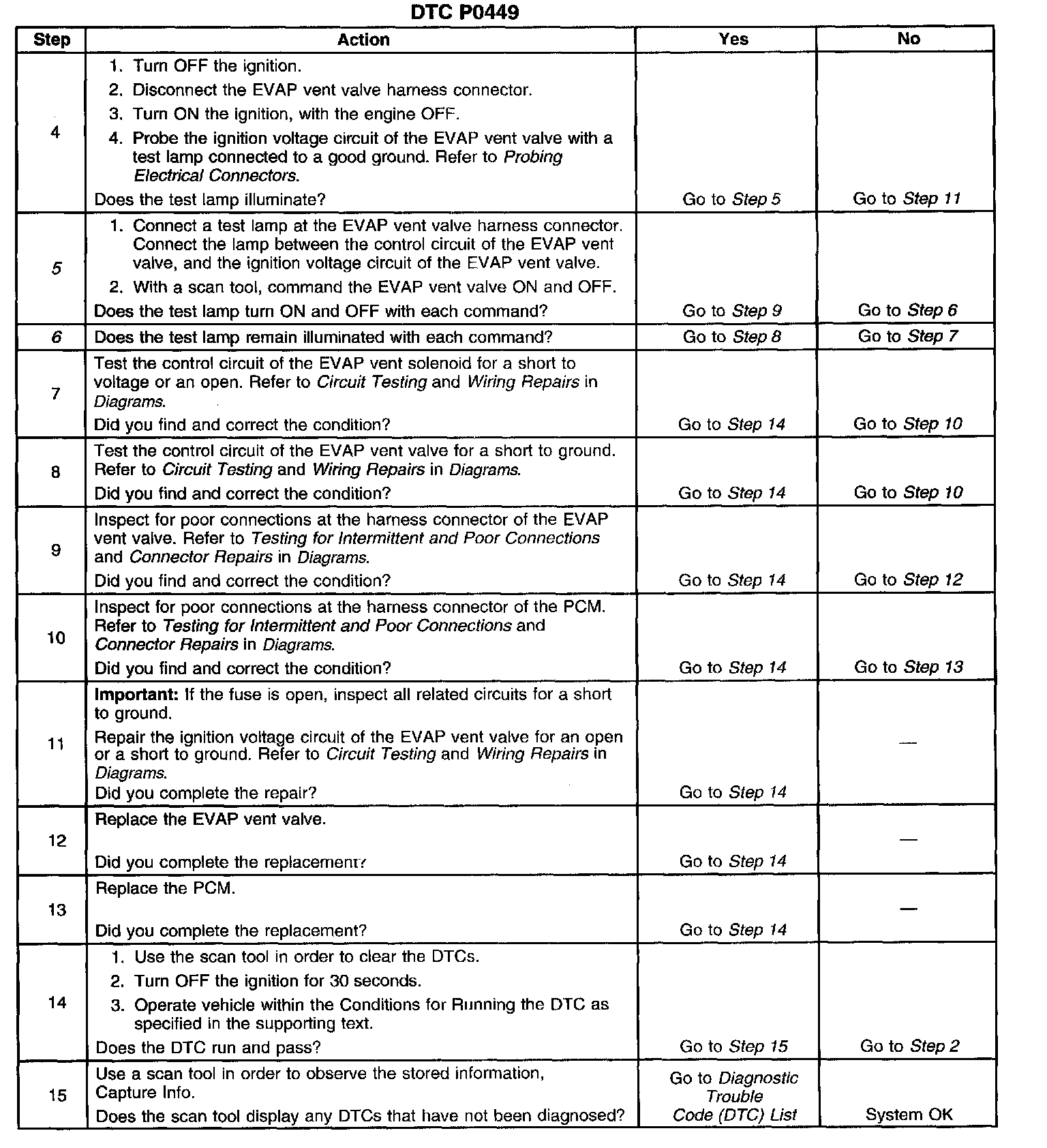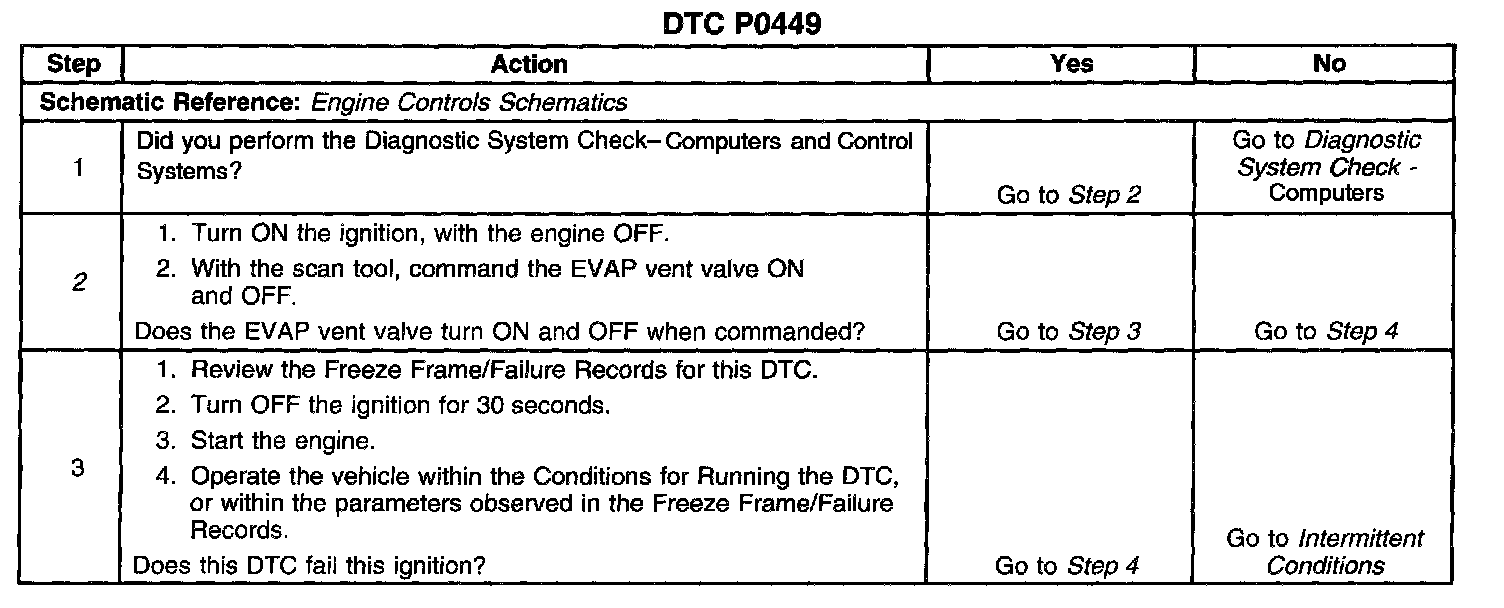 CIRCUIT DESCRIPTIONAn ignition voltage is supplied directly to the Evaporative Emissions (EVAP) canister vent valve. The Powertrain Control Module (PCM) controls the EVAP vent valve by grounding the control circuit via an internal switch called a driver. The primary function of the driver is to supply the ground for the controlled component. The PCM monitors the status of the driver. If the PCM detects an incorrect voltage for the commanded state of the driver, DTC P0449 sets