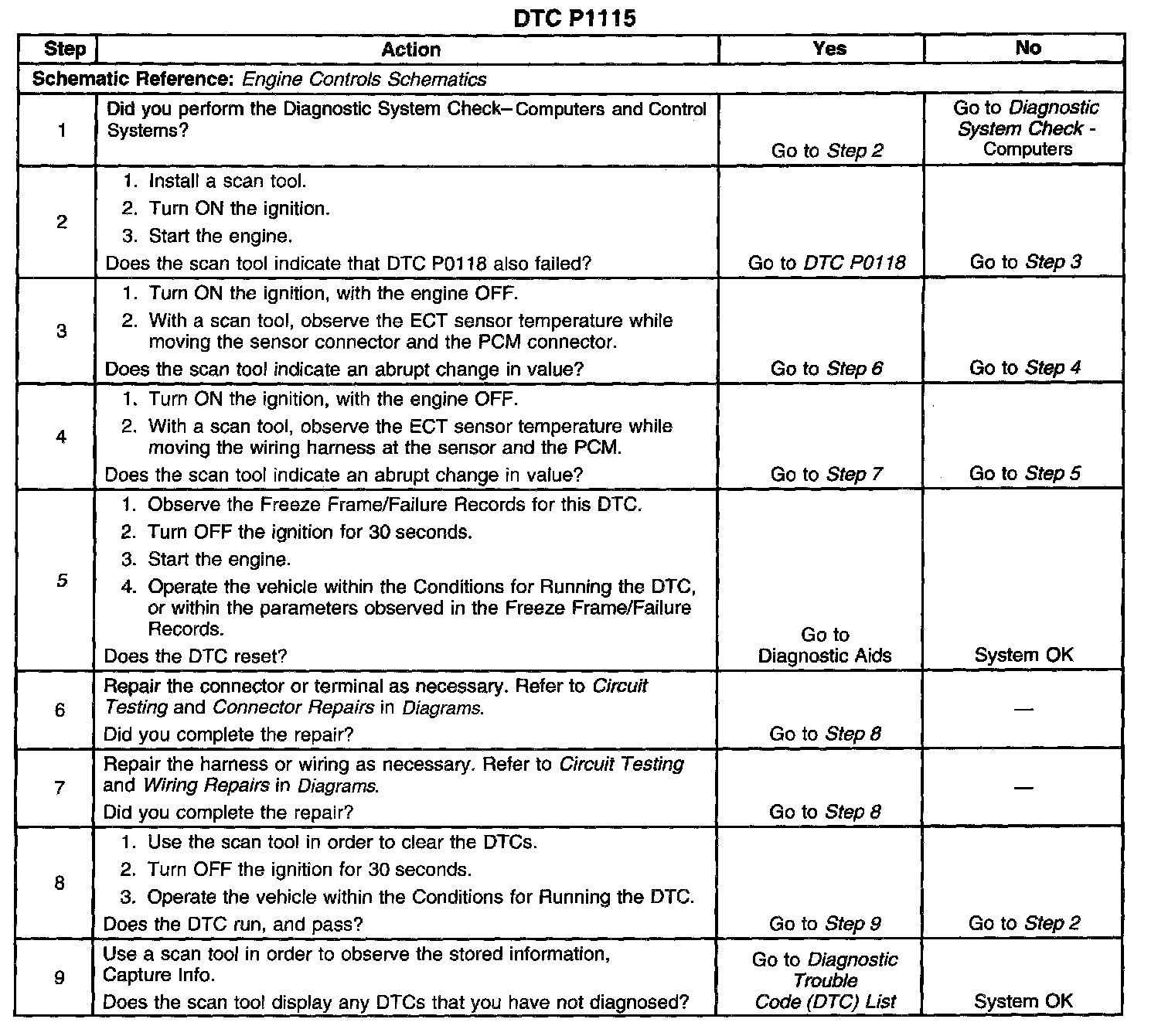 ^ An intermittent open or short to voltage in the ECT sensor signal circuit could result in a DTC P1115. If a high ECT voltage or a low temperature reading is present, additional sensor circuit voltage codes could be set. Refer to any non-intermittent DTCs that are set.