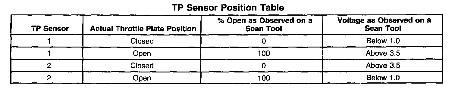 The table shows the percentage and voltage readings of the scan tool based on the position of the TP.