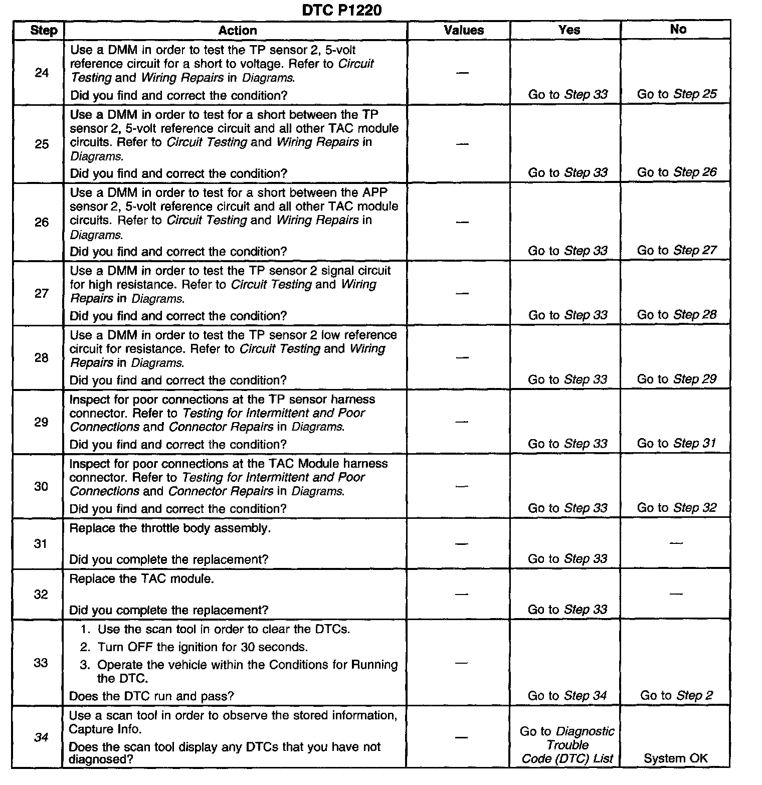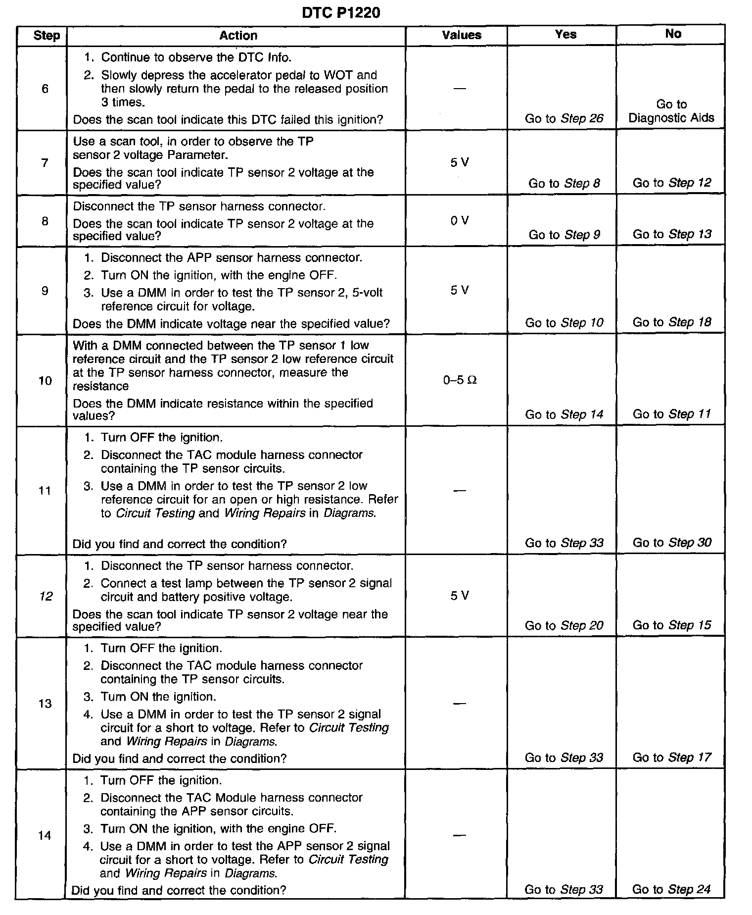 The numbers below refer to the step numbers on the diagnostic table.