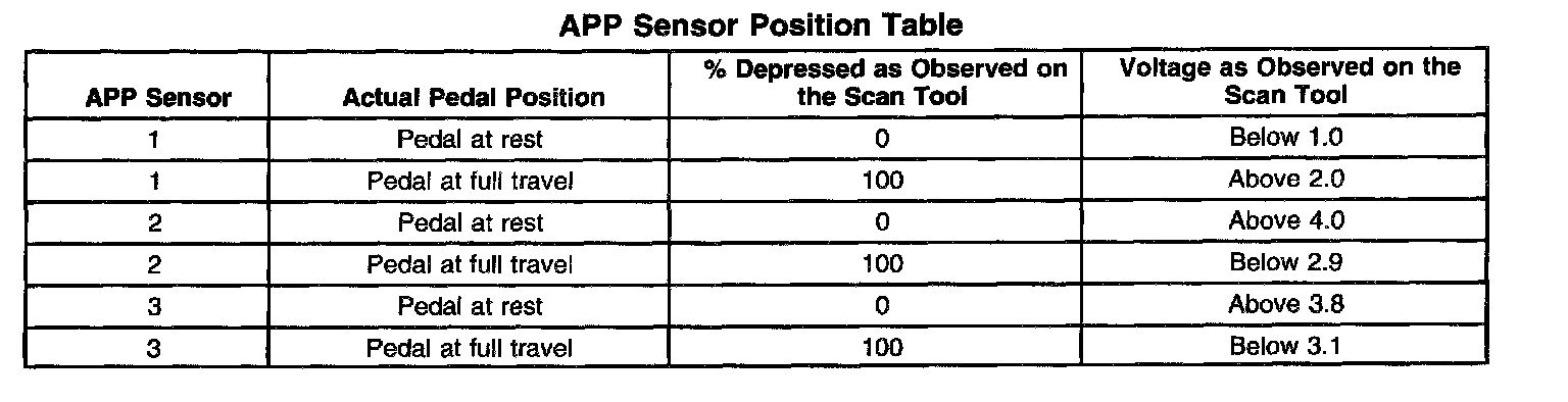 The table shows the percentage and voltage readings of the scan tool based on the position of the APP.