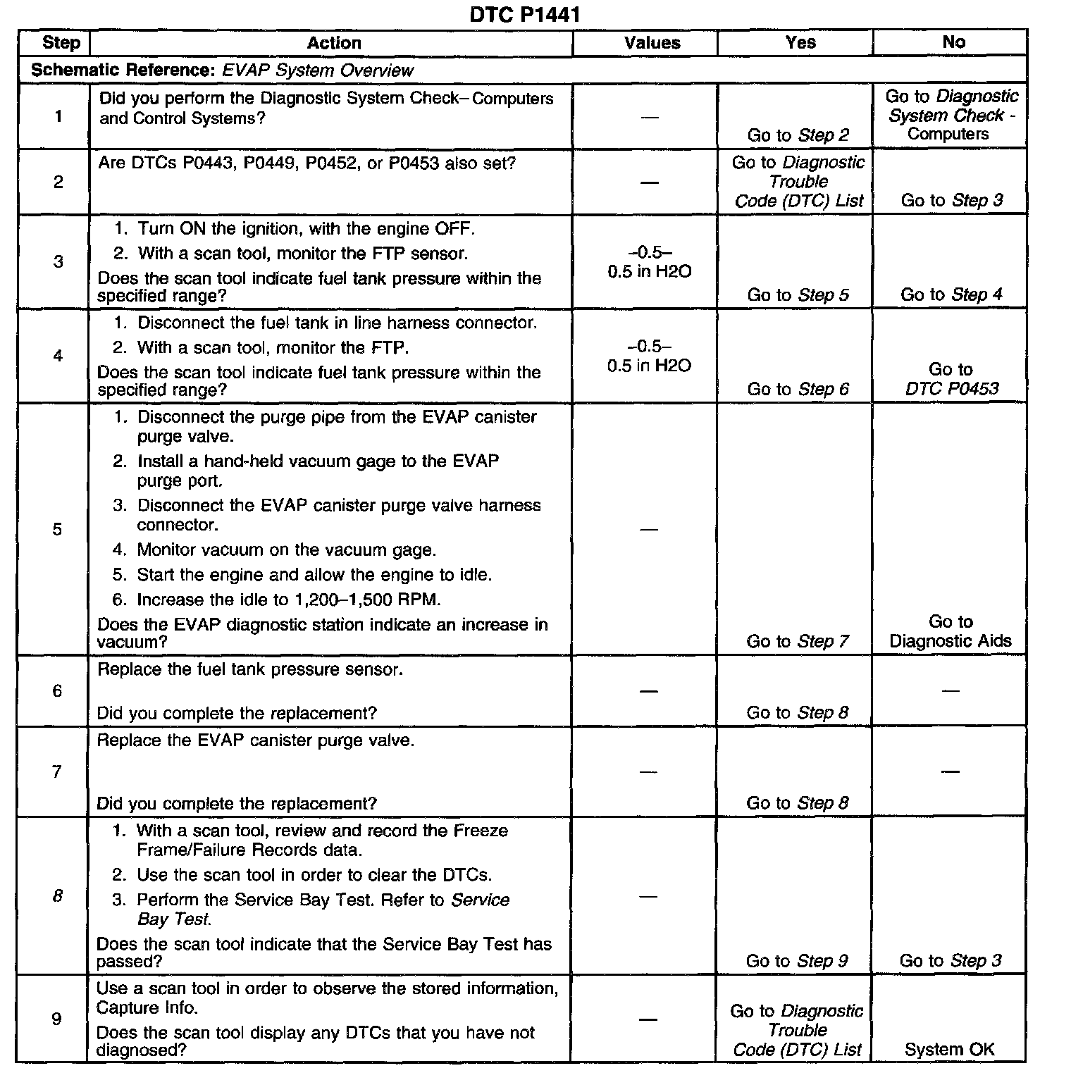 CIRCUIT DESCRIPTIONThis Diagnostic Trouble Code (DTC) tests for undesired intake manifold vacuum flow to the Evaporative Emission (EVAP) system. The Powertrain Control Module (PCM) seals the EVAP system by commanding the EVAP purge valve OFF (closed) and the EVAP vent valve ON (closed). The PCM monitors the Fuel Tank Pressure (FTP) sensor to determine if a vacuum is being drawn on the EVAP system. This DTC will set if the vacuum in the EVAP system is more than a predetermined value within a predetermined time.