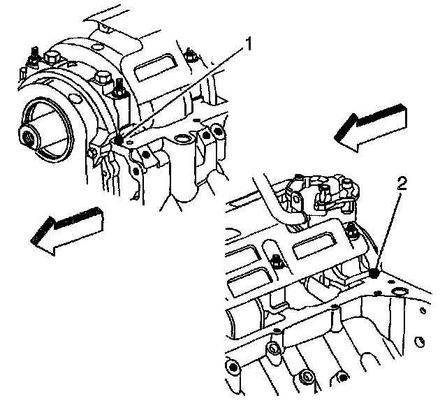 1. Apply sealant GM P/N 12346286 to the side of the front (1) and rear (2) crankshaft bearing caps, on both the left and right sides (4 locations total).