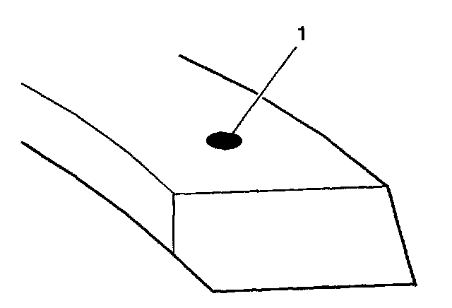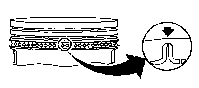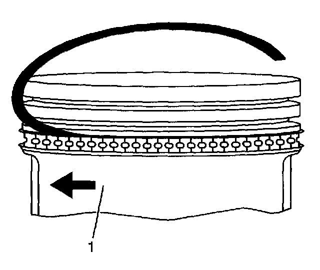 6. Install the upper compression piston ring onto the piston. The mark (1) on the side of the piston ring should face the top of the piston.