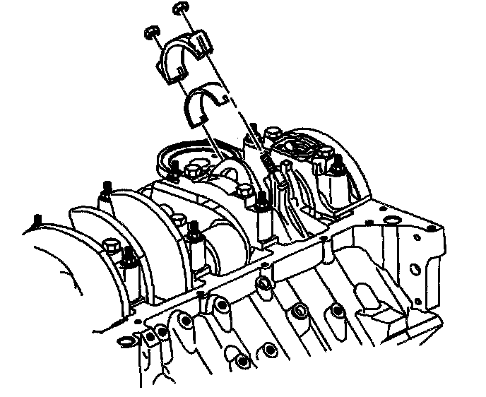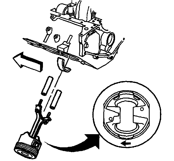Important: The mark on the top of the piston must face the front of the engine block. When assembled, the flanges on the connecting rod and cap should face to the front of block on the left bank and to the rear of block on the right bank.