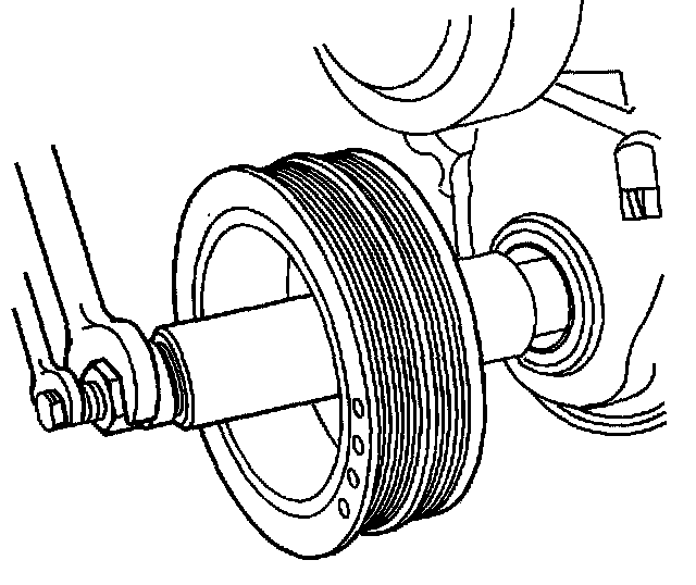 4. Tighten the J 42845 until the crankshaft balancer is completely seated against the crankshaft sprocket.