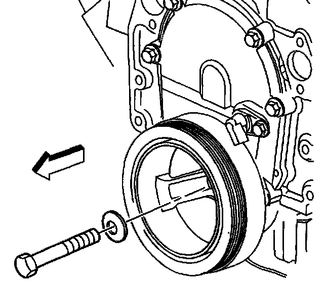 Notice: Ensure the crankshaft balancer is installed to the proper depth. The crankshaft balancer nose must be seated against the crankshaft sprocket. Failure to install the crankshaft balancer properly may result in improper torque to the crankshaft balancer bolt. An improperly torqued crankshaft balancer bolt may loosen causing serious engine damage.