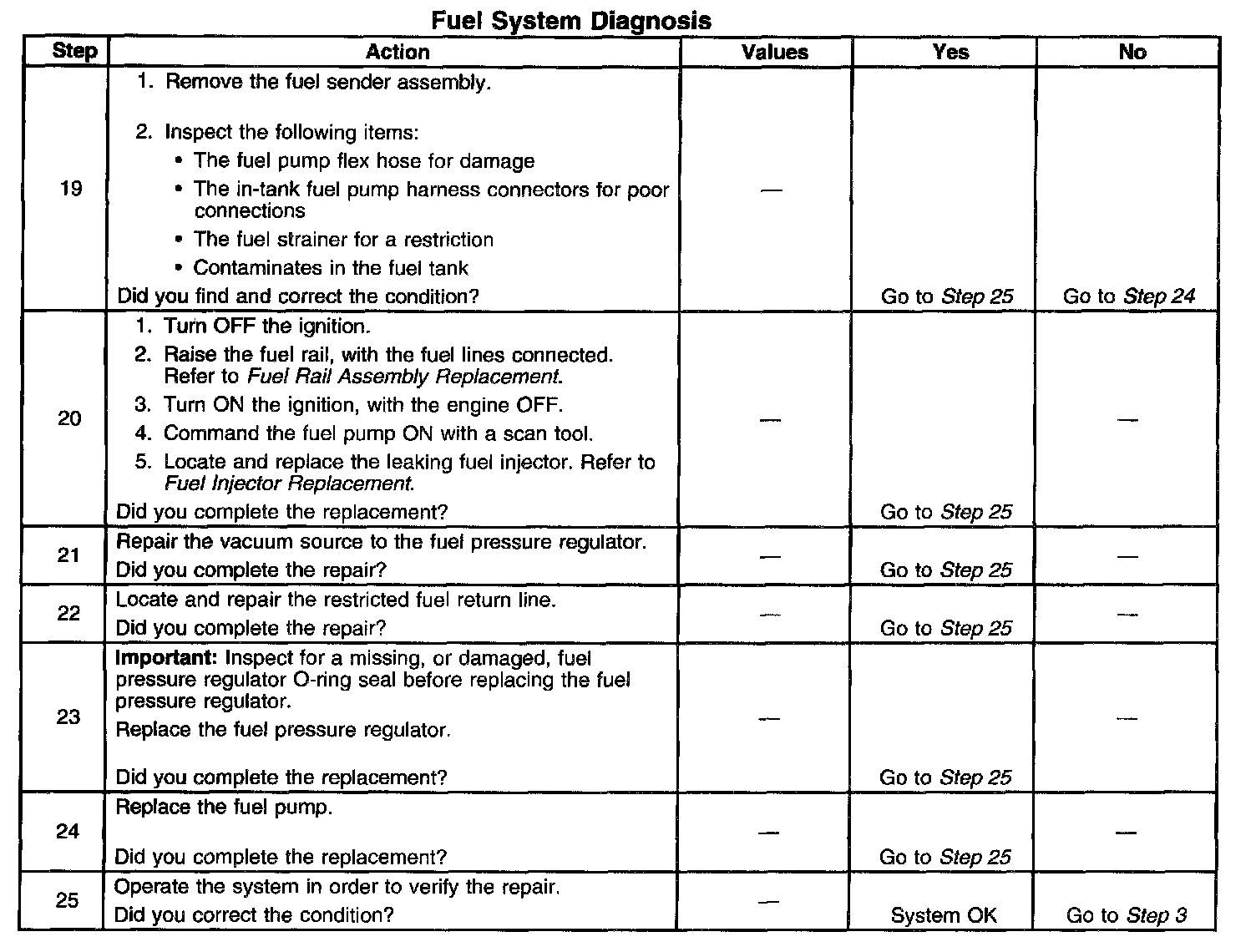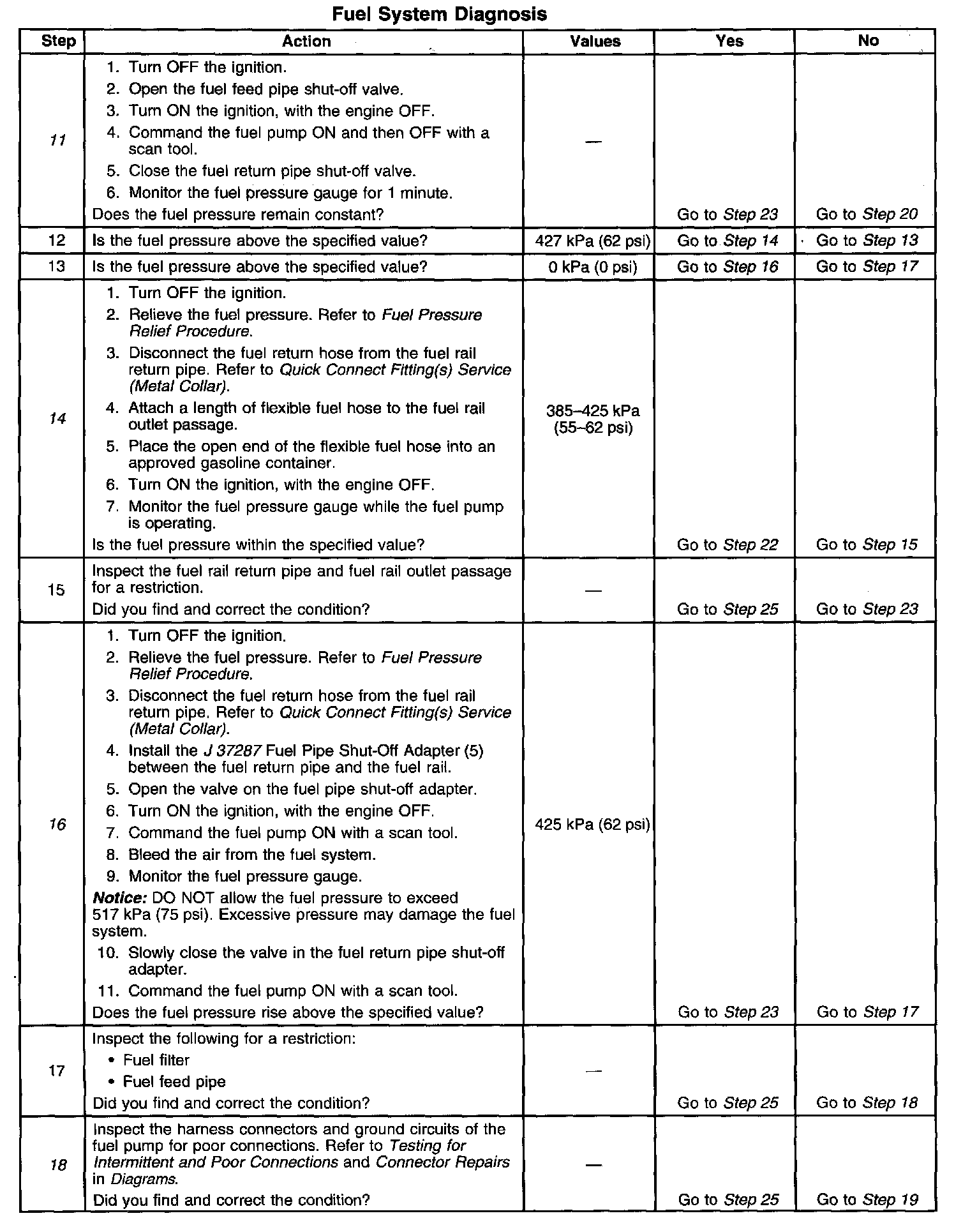 14. This step tests for a restricted fuel return pipe. If the fuel pressure is within the specified values, a restriction in the fuel return pipe is indicated.