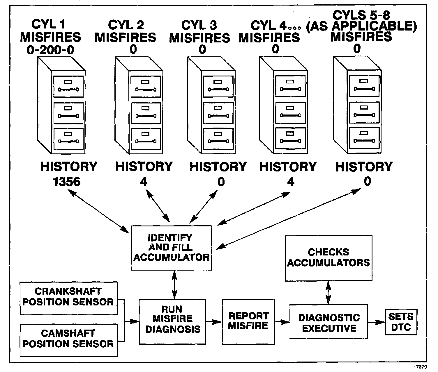 Whenever a cylinder misfires, the misfire diagnostic counts the misfire and notes the crankshaft position at the time the misfire occurred.