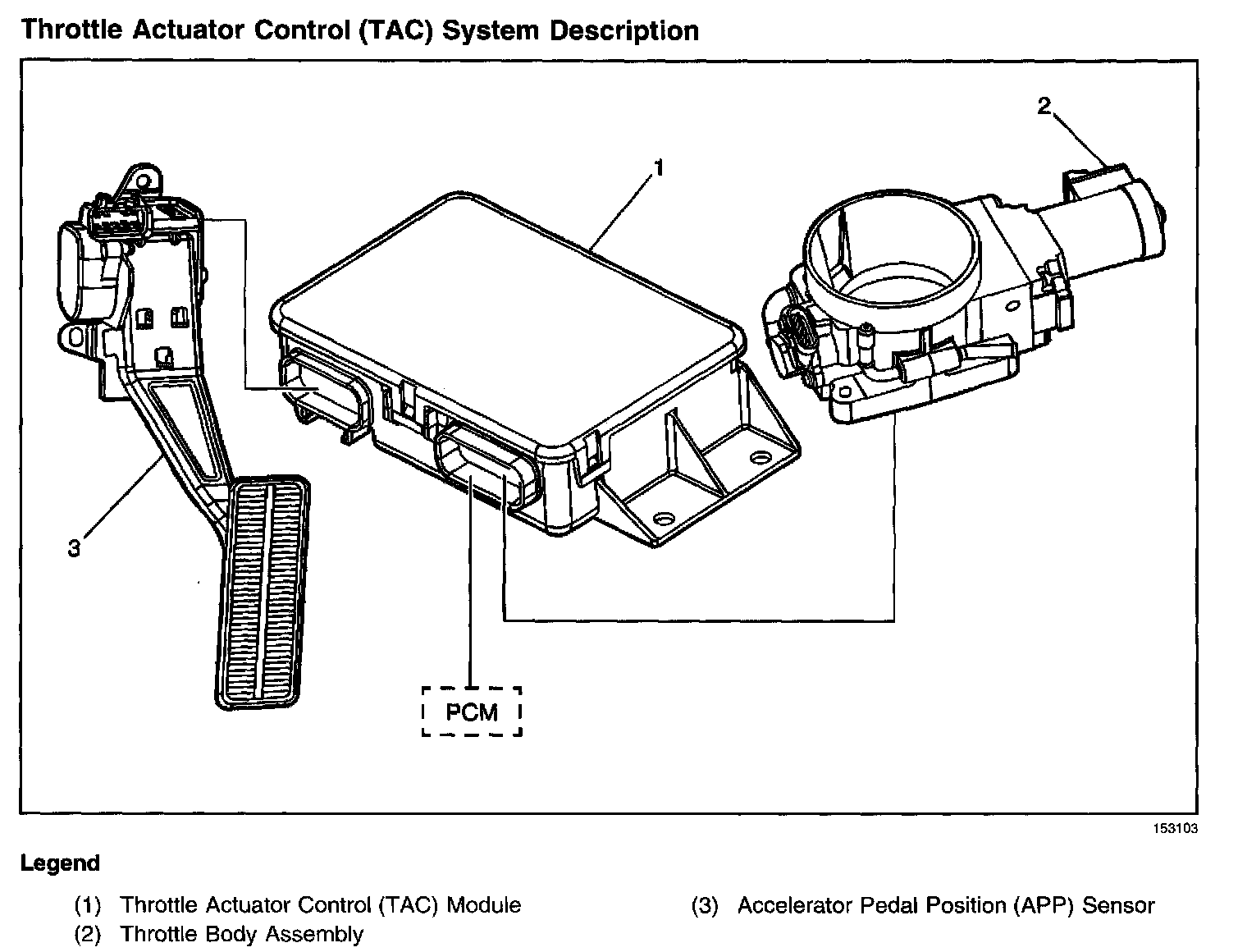 The Throttle Actuator Control (TAC) system uses vehicle electronics and components to calculate and control the position of the throttle blade. This eliminates the need for a mechanical cable attachment from the accelerator pedal to the throttle body. This system also performs the cruise control functions as well.