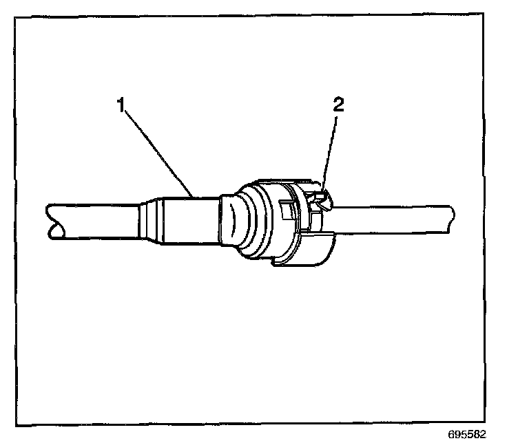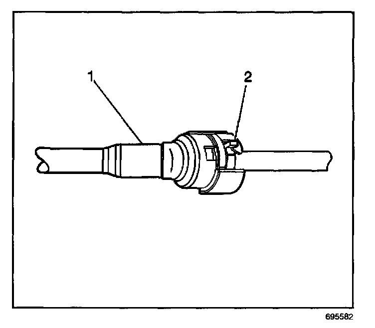 6. To disconnect the EVAP purge pipe connector (1), slide the retaining tab (2) to the release position and separate the connection.