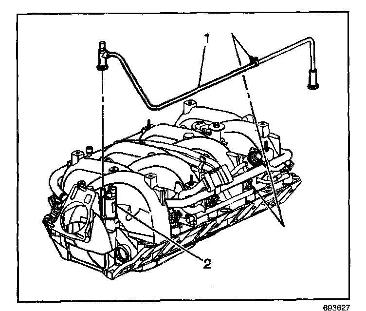 ^ Connect the EVAP purge pipe (1) to the EVAP canister purge valve (2).