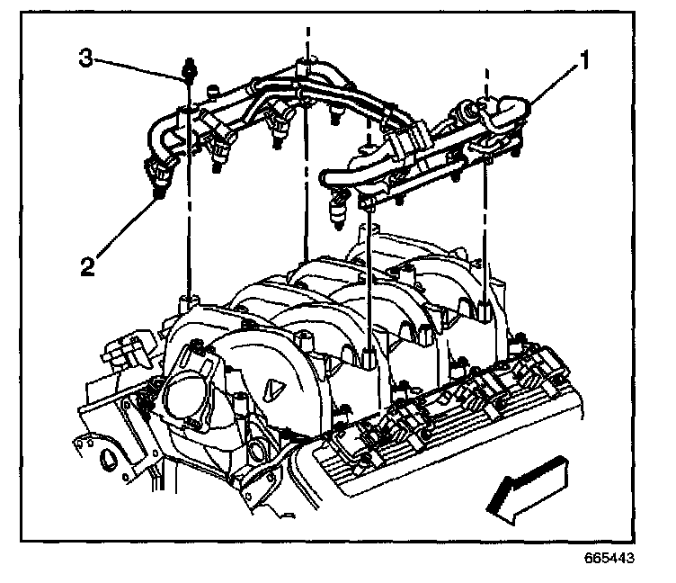 7. Connect the fuel teed and return pipes (1 2) to the fuel rail.