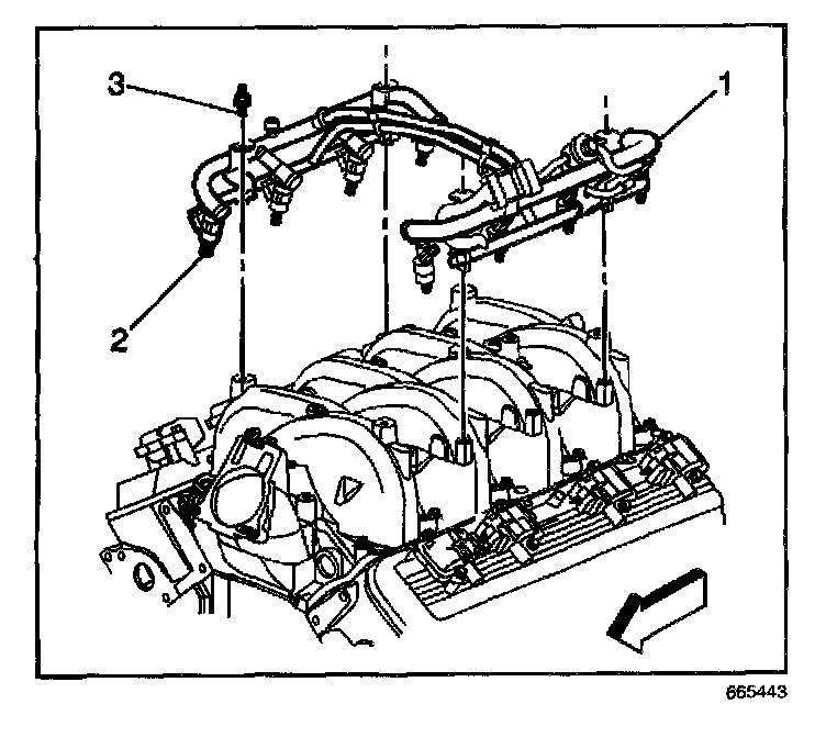 16. Remove the fuel rail attaching bolts (3).