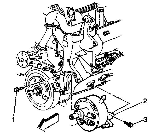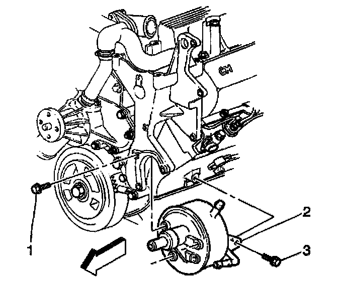 10. Remove the power steering pump mounting bolts (1,3) from the vehicle.