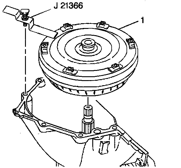 3. Install the J 21366 in order to hold the torque converter assembly (1) in place while moving the transmission assembly around. Remove the J 21366 prior to installing the transmission into the vehicle.