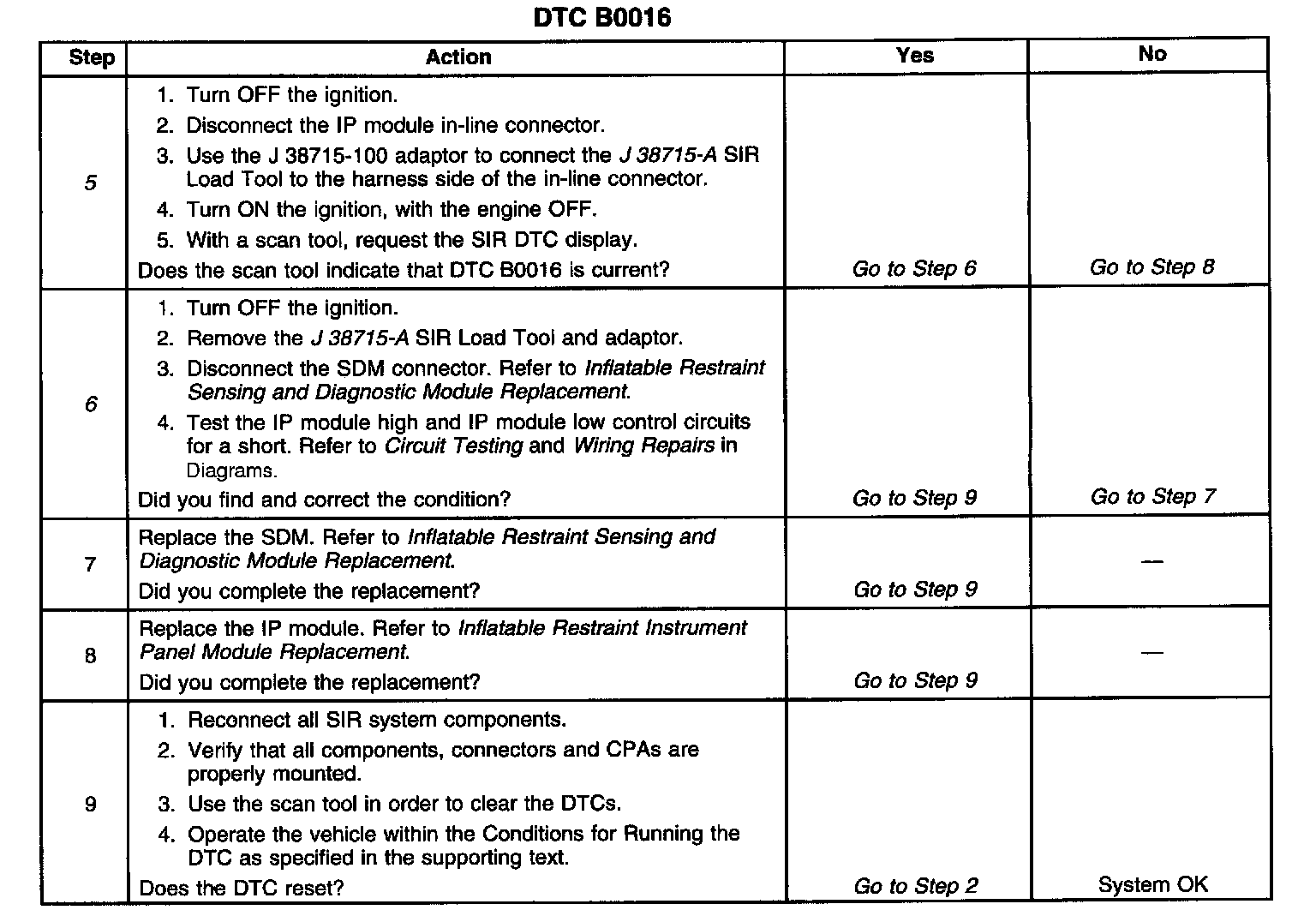 The inflatable restraint IP module deployment loop consists of an IP module, IP module high control circuit, and IP module low control circuit. A shorting bar is used on the IP module connector which will short together the IP module high and IP module low control circuits when the connector is disconnected. This will help to prevent unwanted deployment of the inflator module during servicing. When the ignition is turned ON, the Inflatable Restraint Sensing And Diagnostic Module (SDM) performs continuous diagnostic tests on the deployment loops to check for proper circuit continuity and for shorts to ground or voltage. If a malfunction is detected, a DTC will be stored.
