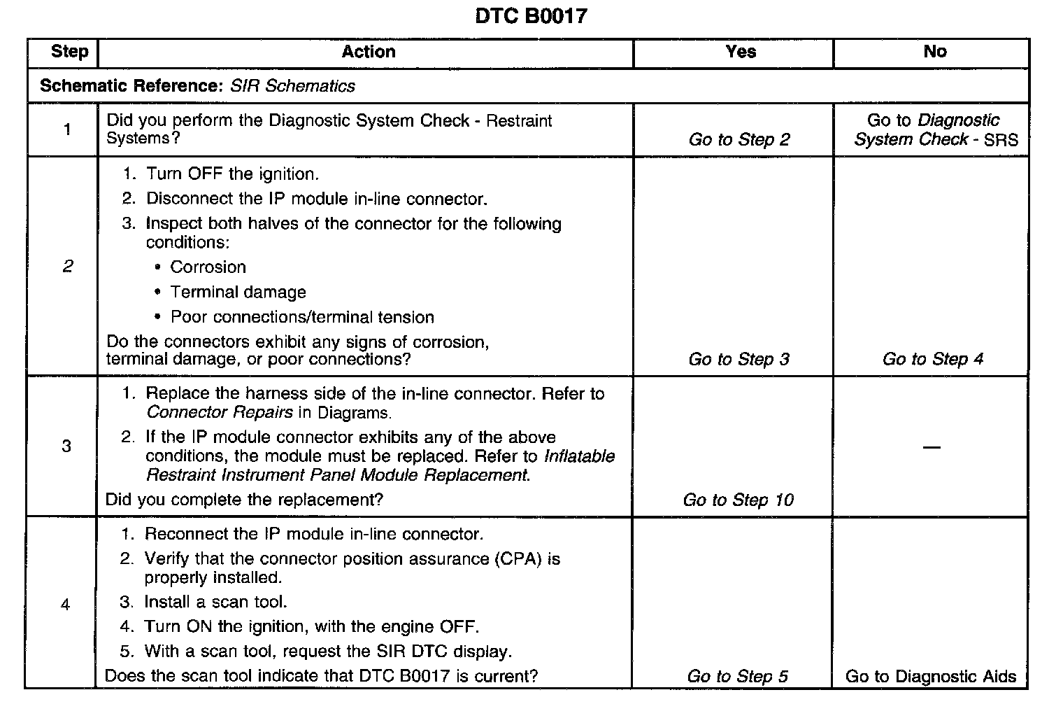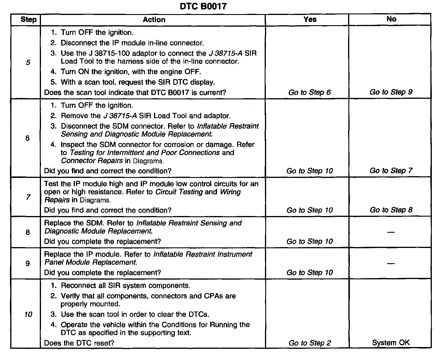 The inflatable restraint IP module deployment loop consists of an IP module, IP module high control circuit, and IP module low control circuit. A shorting bar is used on the IP module connector which will short together the IP module high and IP module low control circuits when the connector is disconnected. This will help to prevent unwanted deployment of the inflator module during servicing. When the ignition is turned ON, the Inflatable Restraint Sensing And Diagnostic Module (SDM) performs continuous diagnostic tests on the deployment loops to check for proper circuit continuity and for shorts to ground or voltage. If a malfunction is detected, a DTC will be stored.
