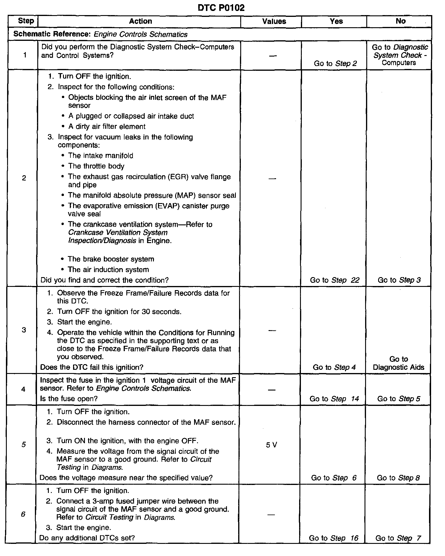 CIRCUIT DESCRIPTIONThe Mass Air Flow (MAF) sensor is an air flow meter that measures the amount of air entering the engine. The Powertrain Control Module (PCM) uses the MAF sensor frequency signal in order to provide the correct fuel delivery for a wide range of engine speeds and loads. A small quantity of air entering the engine indicates deceleration or idle. A large quantity of air entering the engine indicates an acceleration or high load situation. The MAF sensor has an ignition 1 voltage circuit, a ground circuit and a signal circuit. The PCM applies a voltage to the sensor on the signal circuit. The sensor uses the voltage in order to produce a frequency based on inlet air flow through the sensor bore. DTC P0102 will set if the PCM detects a frequency signal lower than the possible range of a normally operating MAF sensor.